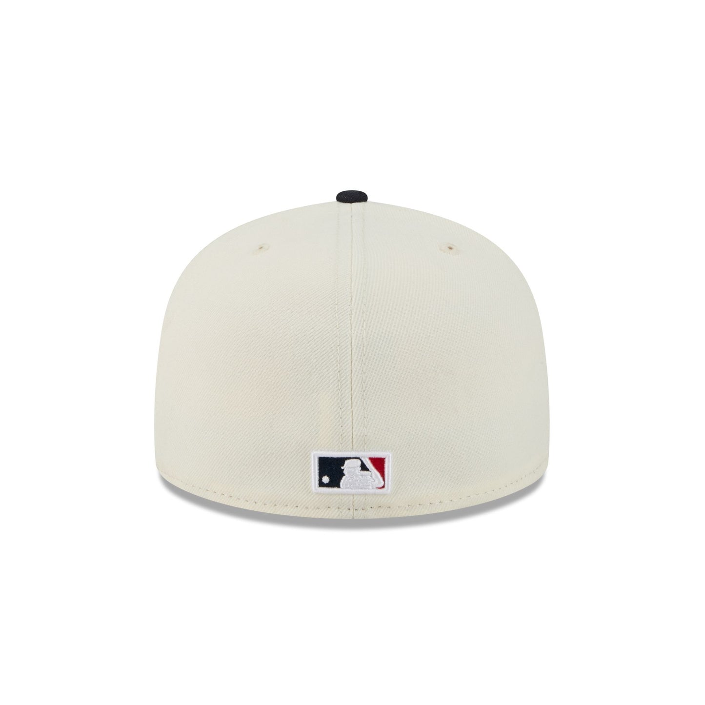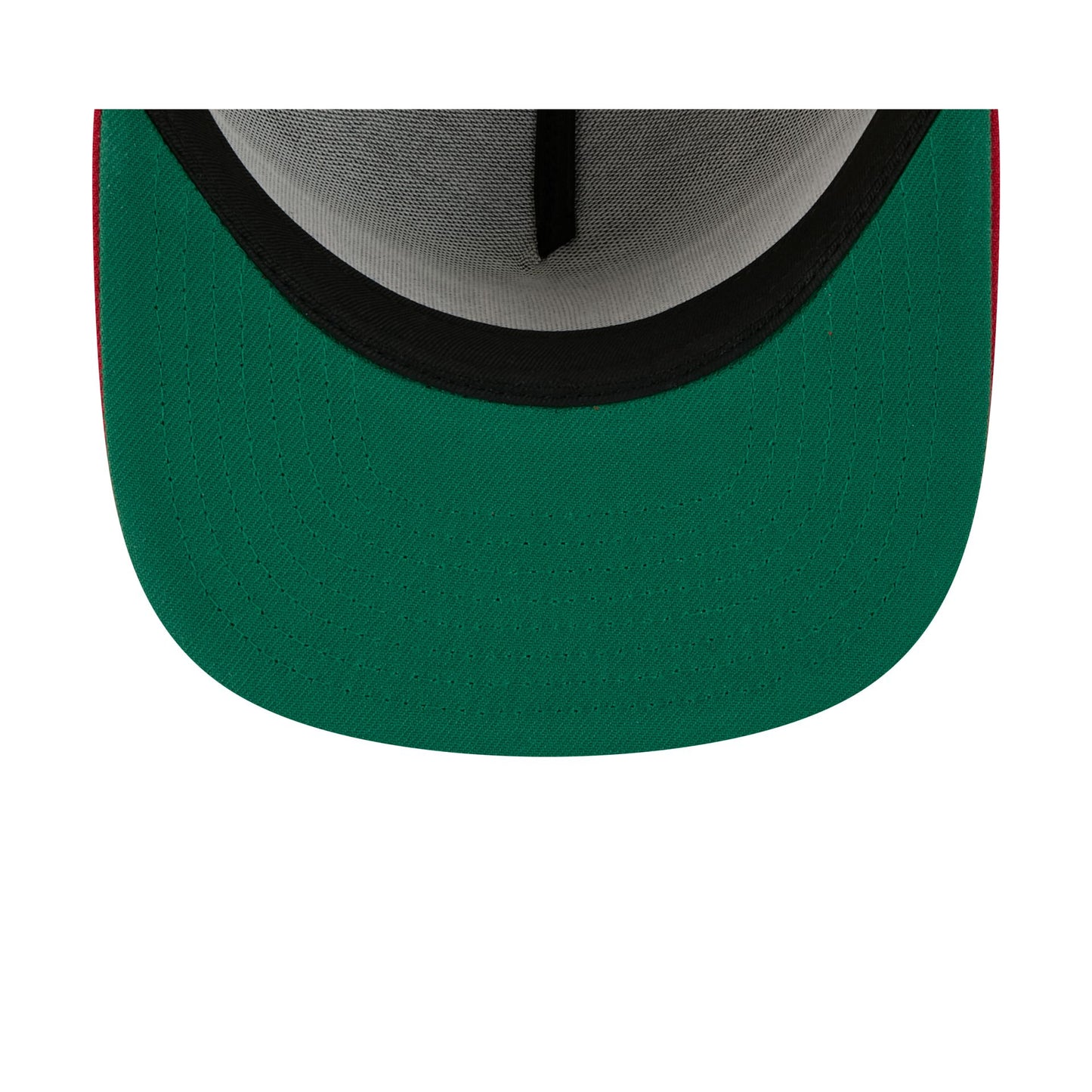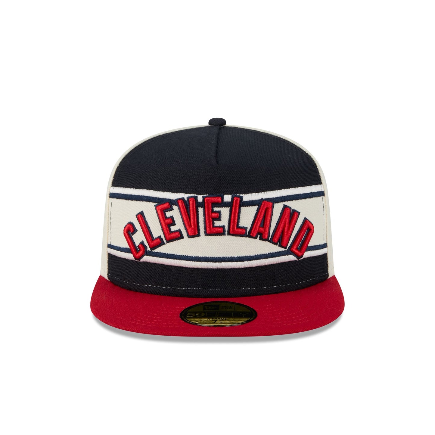 The Cleveland Guardians Summer Derby 59FIFTY A-Frame Fitted Cap features an embroidered Guardians Cooperstown wordmark over team color stripes at the front panels with a matching MLB Batterman logo at the rear. Additional details include a 2019 All-Star Game patch at the right-wear side, a red visor, and a green undervisor.