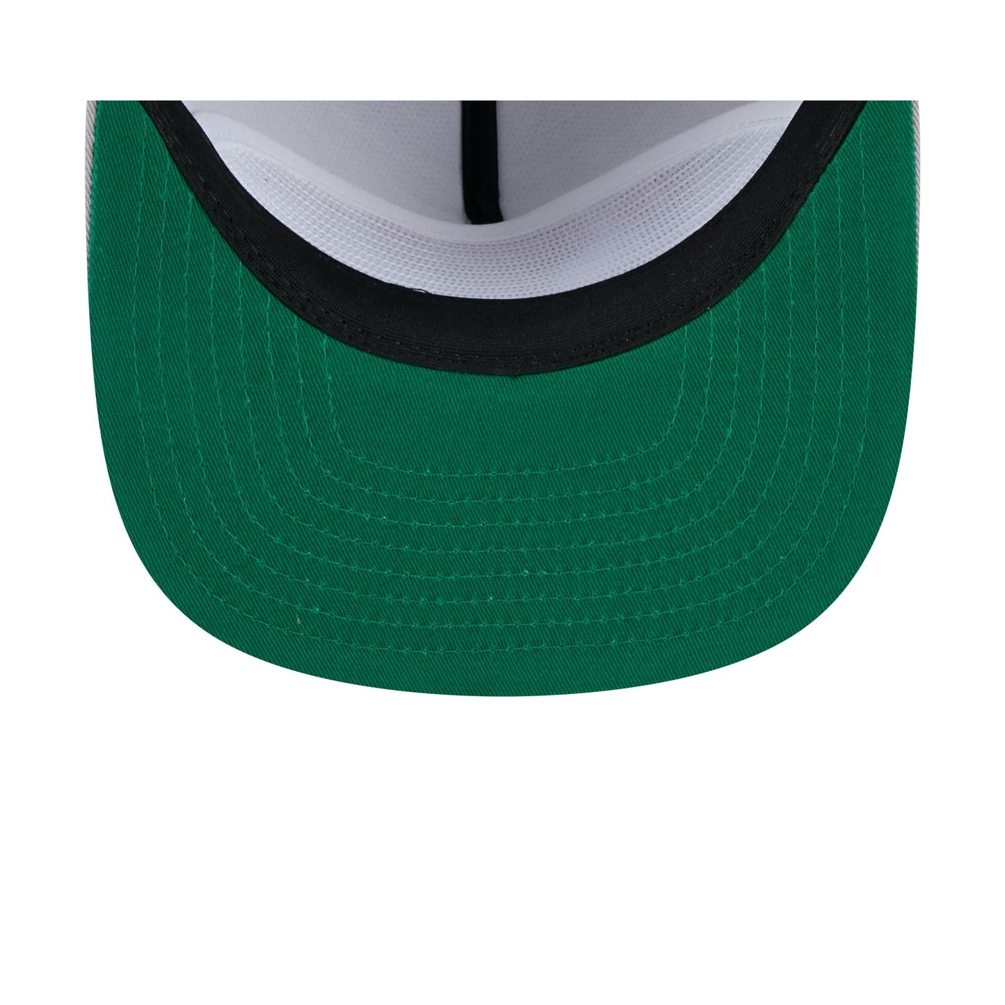The Cleveland Guardians Vintage Gray Golfer features an embroidered "PROPERTY OF" Guardians wordmark at the front panels with a team logo at the right-wear side and a rope at the visor. Additional details include a snapback closure at the rear and a green undervisor.