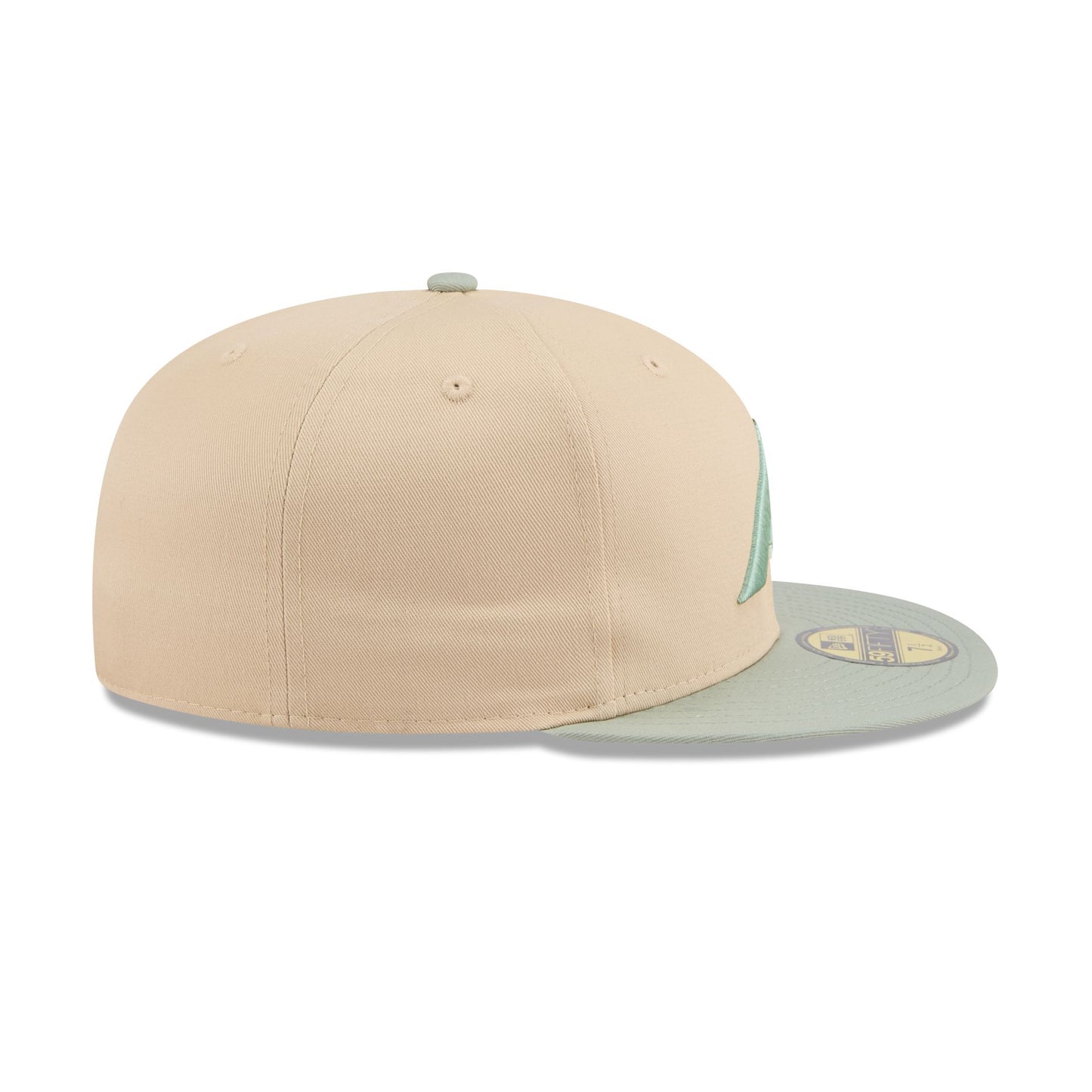 The Club América Ivory 59FIFTY Fitted Cap features an embroidered América logo at the front panels with a matching team wordmark at the rear, a pastel green visor, and a gray undervisor.