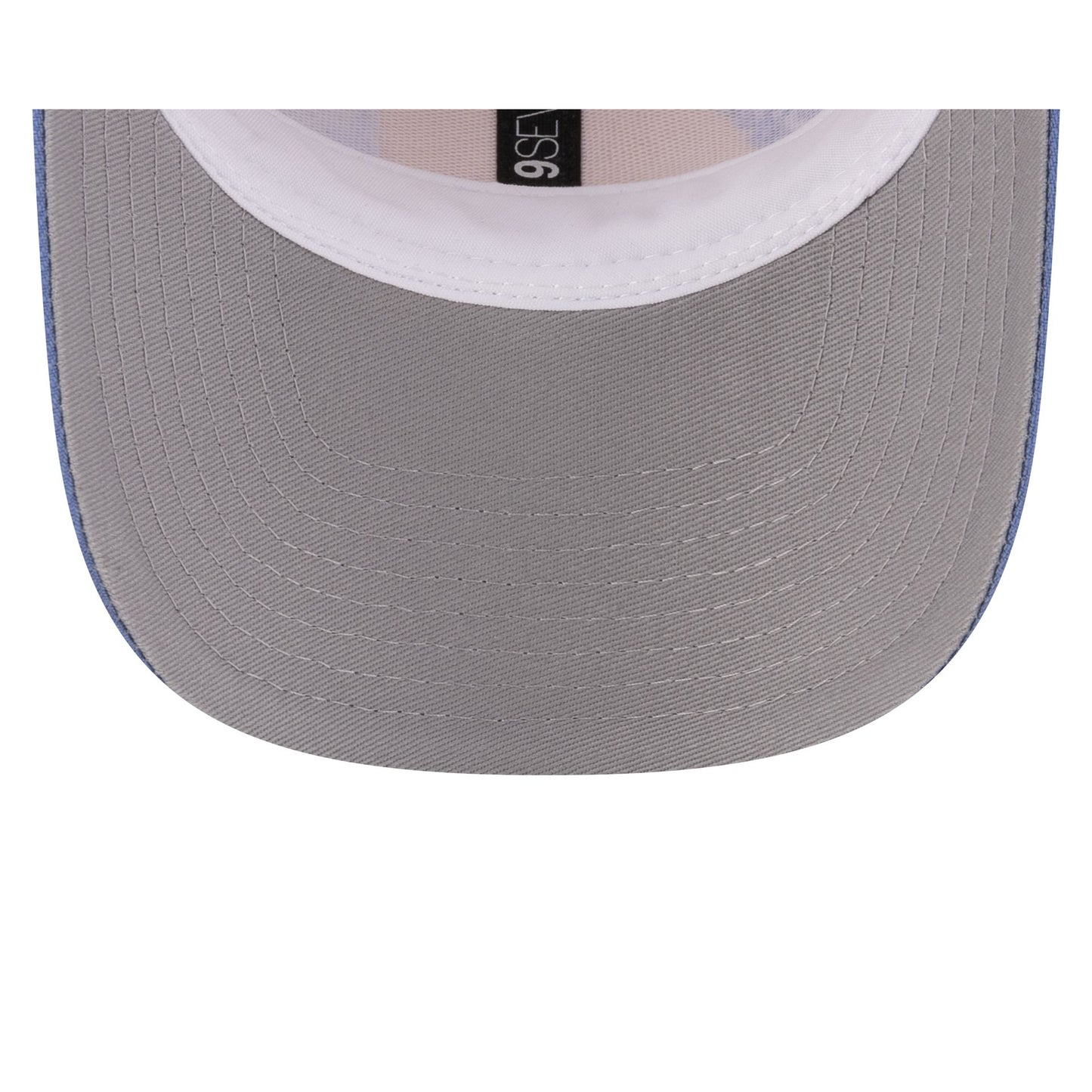 The Club León Dual Logo 9SEVENTY Trucker features the León primary and alternative logos embroidered at the front panels with a matching team wordmark above a snapback closure at the rear. Additional details include a blue visor and a gray undervisor.