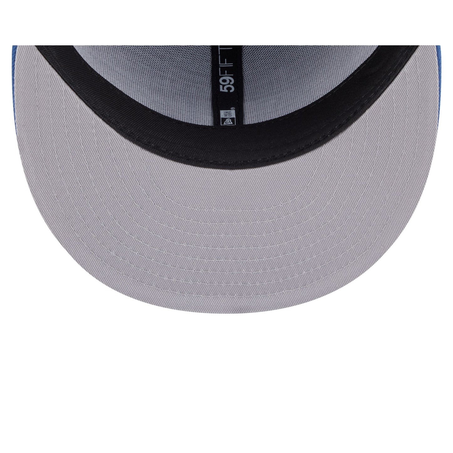 The Club Necaxa Indigo 59FIFTY Fitted Cap features the Necaxa primary logo embroidered at the front panels with alternate team logos throughout the crown, a team wordmark at the rear, and a gray undervisor.