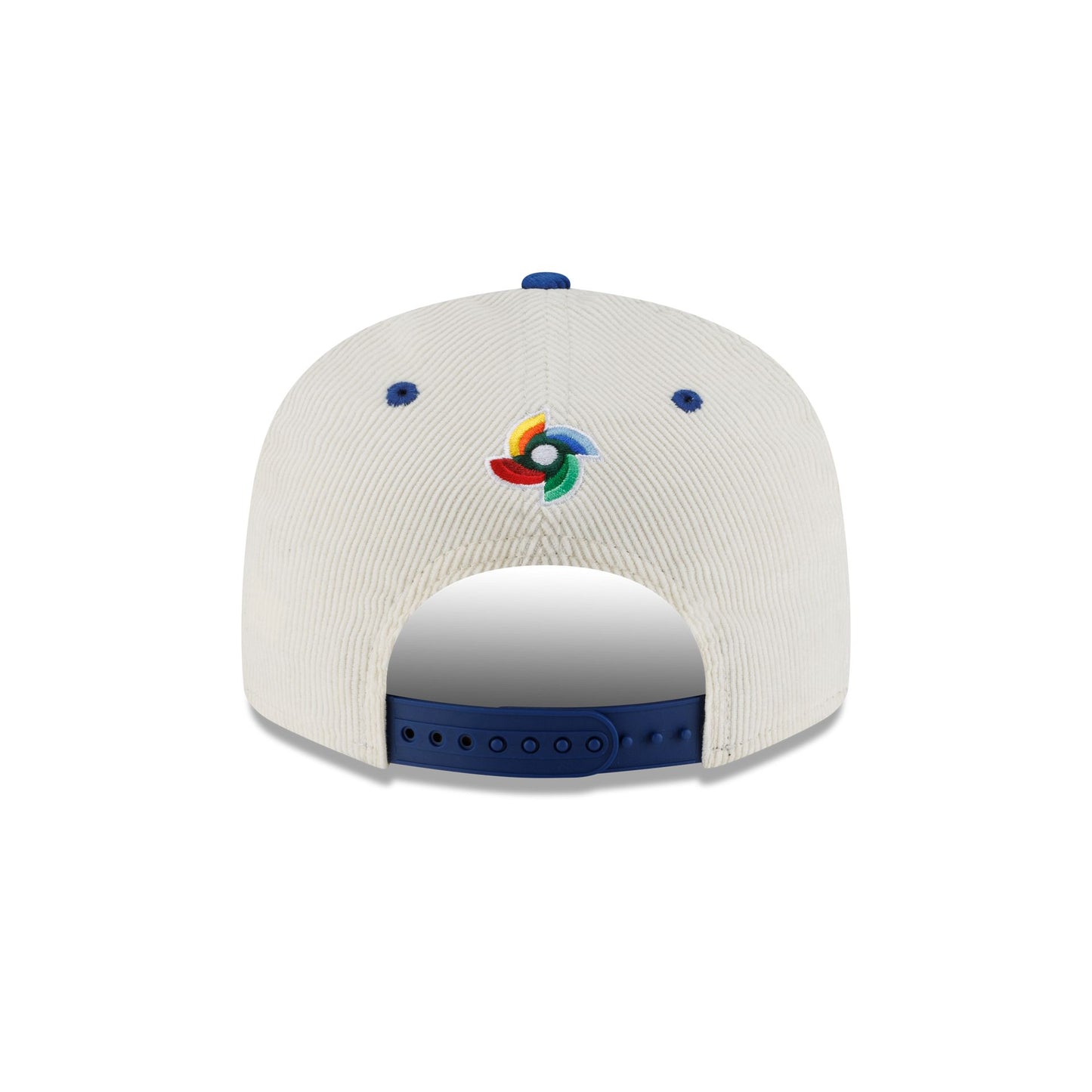 The Colombia 2025 World Baseball Classic Corduroy 9FIFTY Snapback features an embroidered Colombia wordmark at the front panels against a corduroy fabrication with their Flag at the right-wear side. Additional details include the World Baseball Classic logo above an adjustable snapback closure at the rear and a green undervisor.