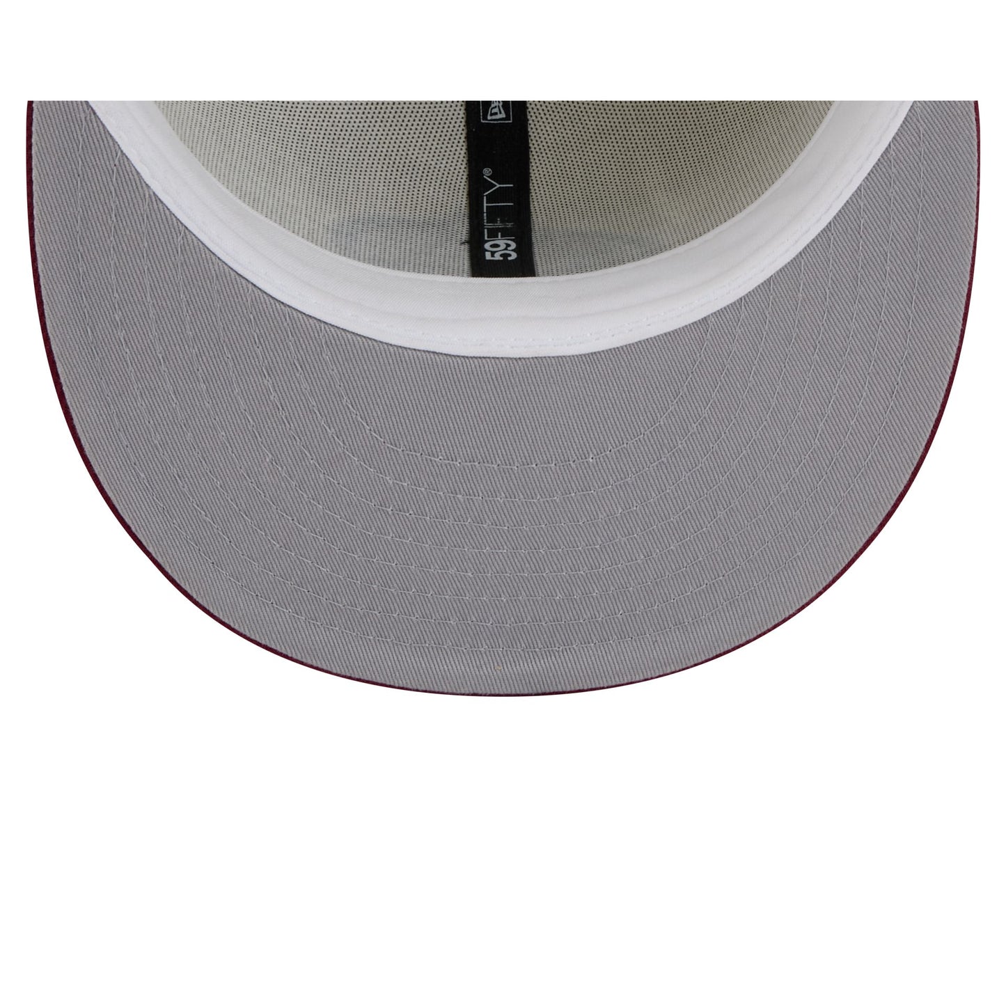 The Colorado Avalanche Chrome White 59FIFTY Fitted Cap features an embroidered Avalanche logo at the front panels with a matching NHL Shield at the rear and a gray undervisor.