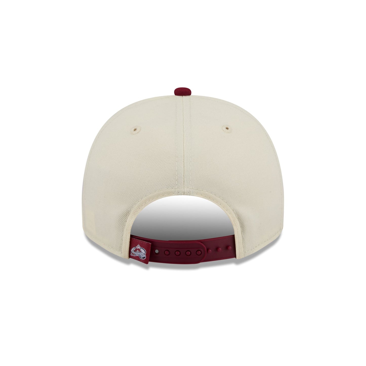 The Colorado Avalanche Chrome White Classic 9FIFTY A-Frame Snapback features an embroidered Avalanche graphic at the front panels with an adjustable snapback closure at the rear and a green undervisor.