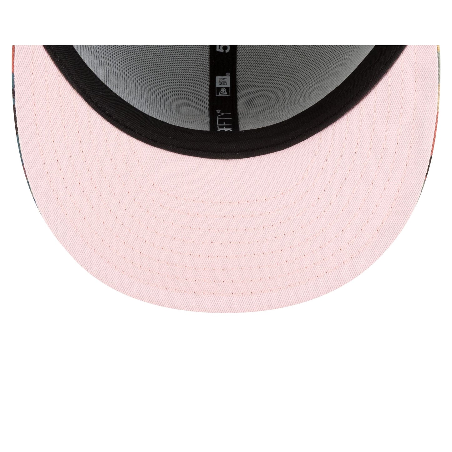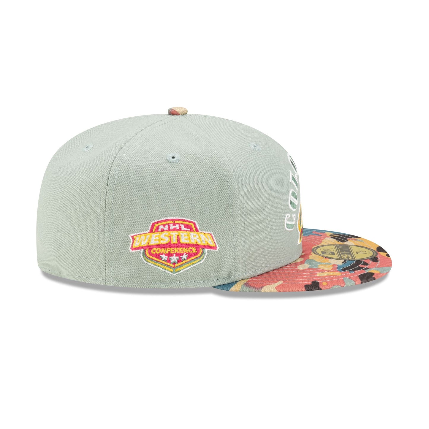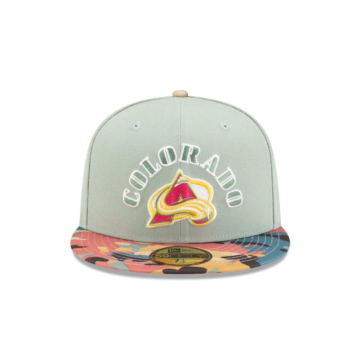 The Colorado Avalanche Retro Everest Camo 59FIFTY Fitted Cap features an embroidered Avalanche logo at the front panels with a team patch at the right-wear side and the NHL Shield at the rear. Additional details include a camo visor and a pink undervisor.