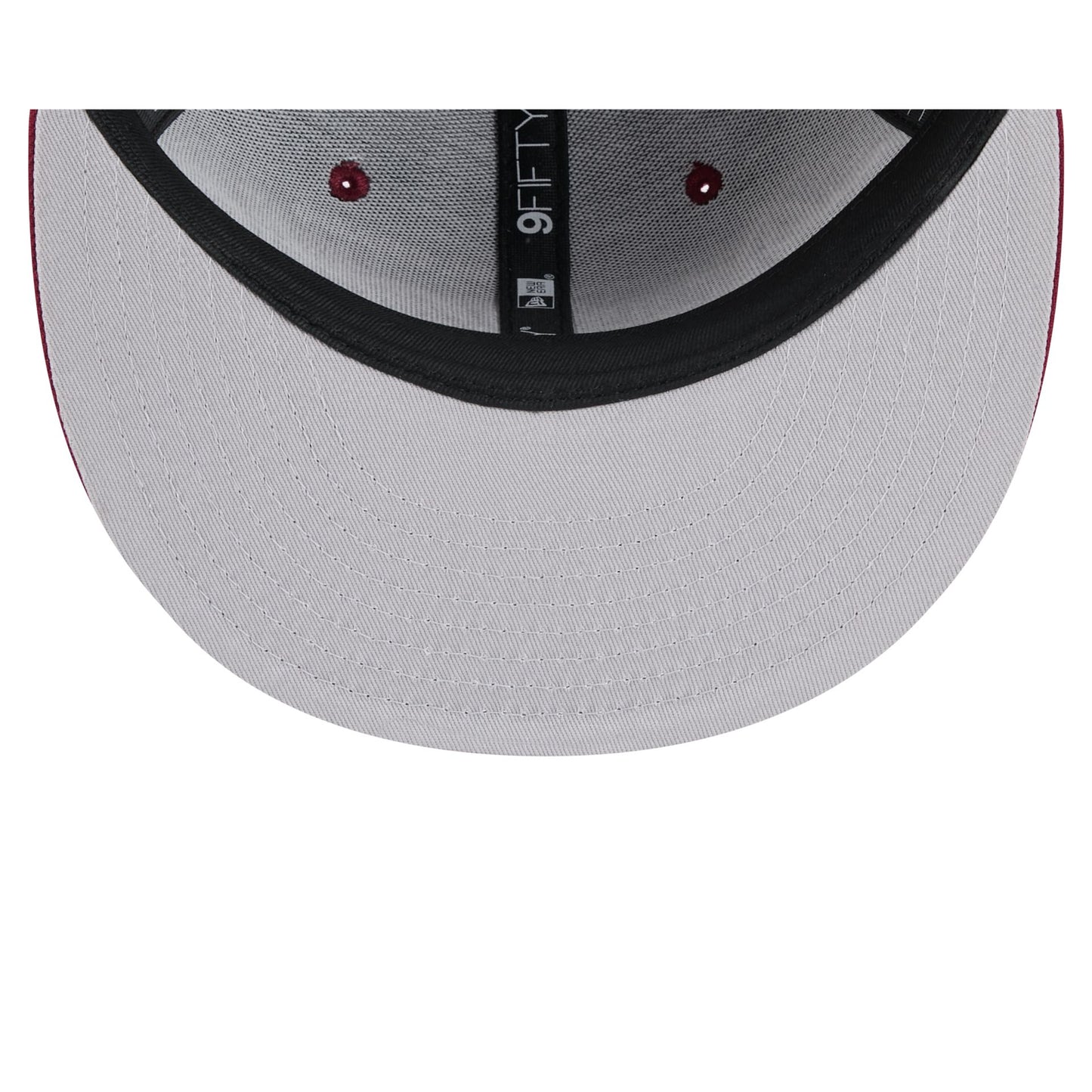 The Colorado Avalanche Script 9FIFTY Snapback features an embroidered Avalanche wordmark at the front panels with a team logo at the right-wear side. Additional details include a snapback closure at the rear and a gray undervisor.