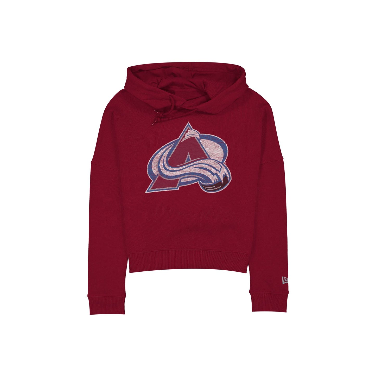 The Colorado Avalanche Wash Logo Red Women's Hoodie features a screen-printed Avalanche logo at the front with kangaroo pockets and adjustable drawstrings at the hood.