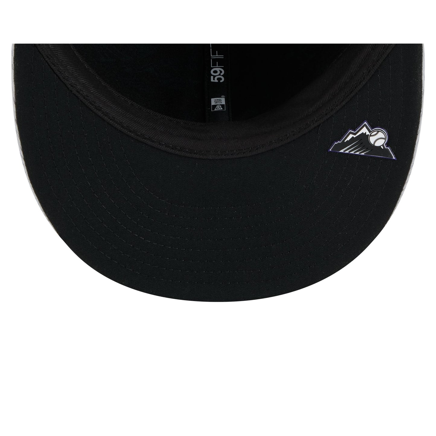 The Colorado Rockies 2025 Clubhouse Gray F9FIFTY Fitted Cap features an embroidered Rockies logo at the front panels with a matching MLB Batterman logo at the rear and a dashmark mesh fabrication throughout. Additional details include a silicone team tag on the right-wear side and team logo on the undervisor.