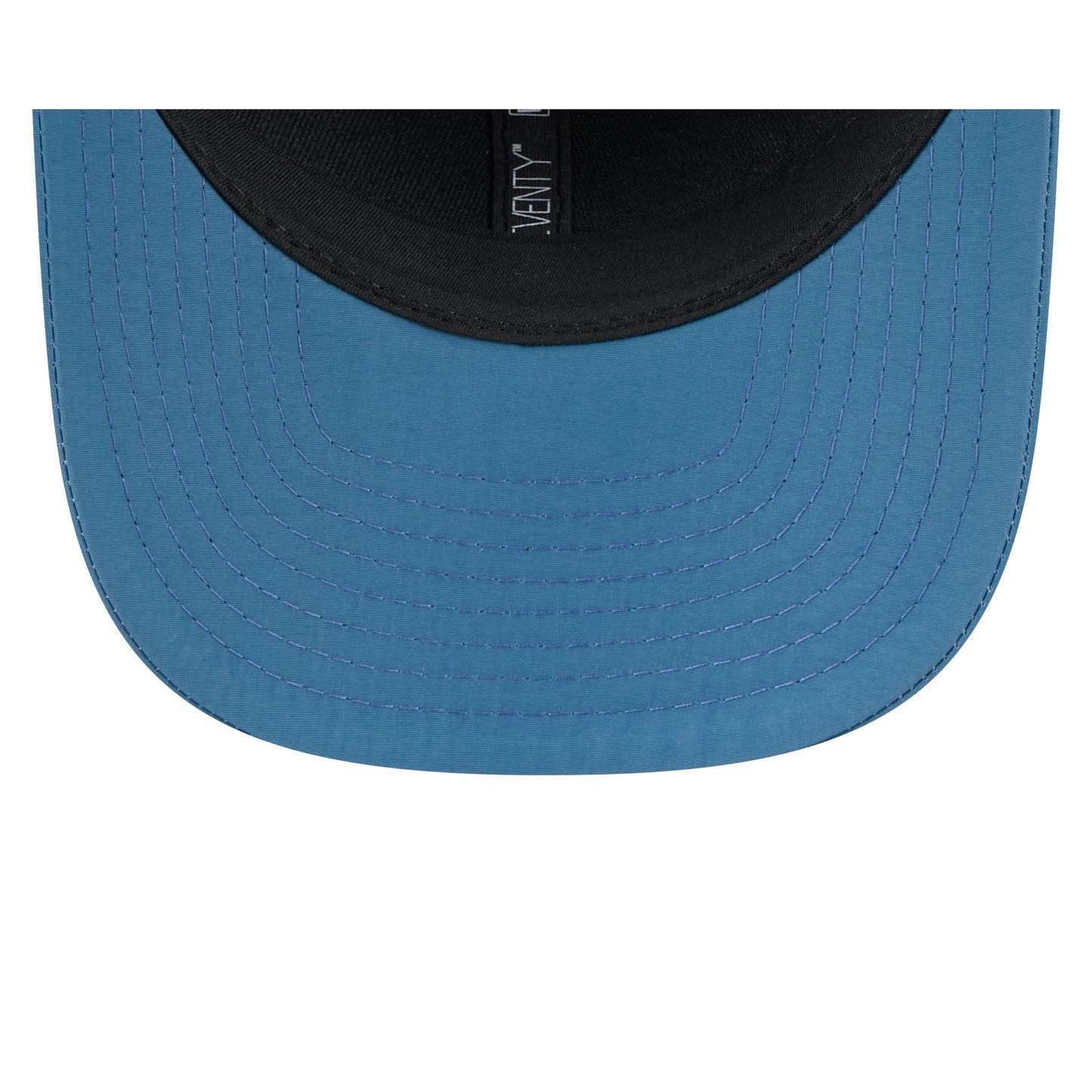 The Colorado Rockies Indigo 9SEVENTY Trucker features an embroidered Rockies wordmark patch at the front panels with a mesh back, a snapback closure at the rear, and a blue undervisor.