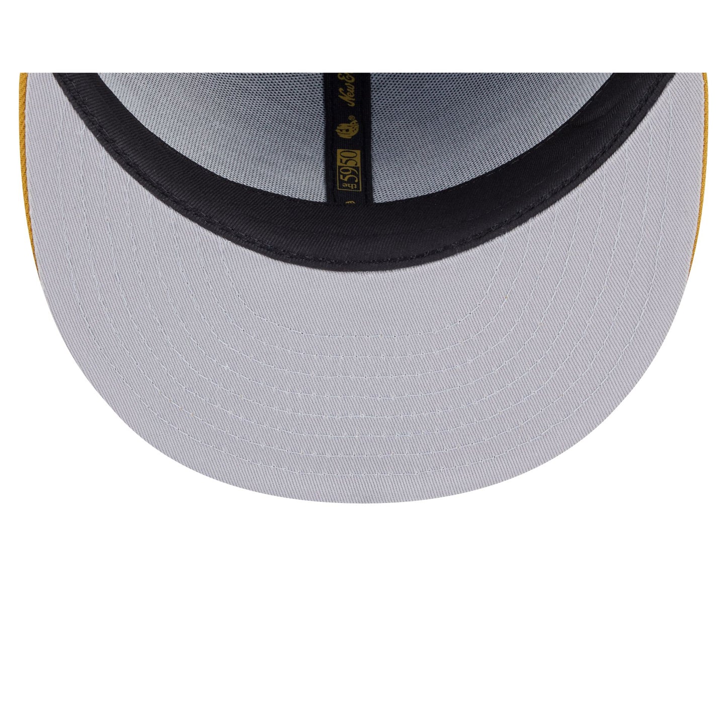 The Colorado Rockies Metallic Gold Logo 59FIFTY Fitted Cap features an embroidered gold Rockies logo at the front panels with a matching MLB Batterman logo at the rear. Additional details include a gold visor and a gray undervisor.