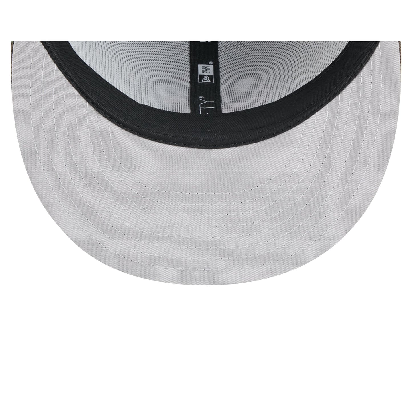 The Columbus Blue Jackets Camo 9FIFTY Trucker features an embroidered Blue Jackets logo at the front panels with a team tag on a snapback closure at a mesh rear and a gray undervisor.