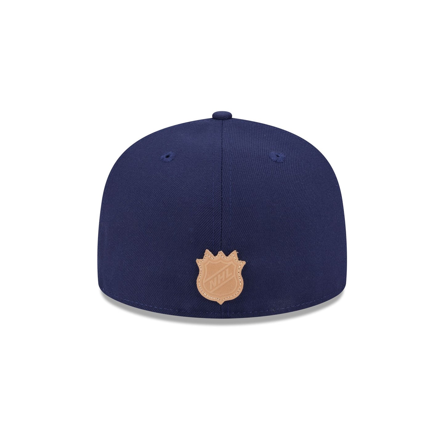 The Columbus Blue Jackets Leather Visor 59FIFTY Fitted Cap features an embroidered Blue Jackets logo at the front panels with a cream leather visor. Additional details include an NHL Shield logo at the rear and a green undervisor with leather accents throughout.