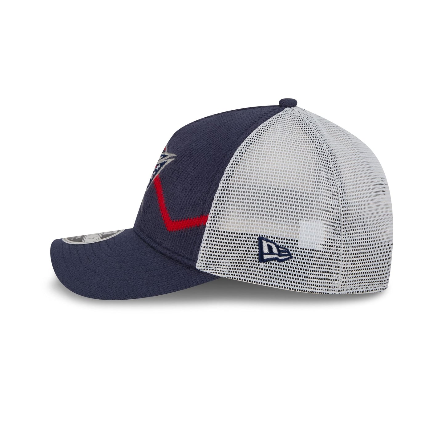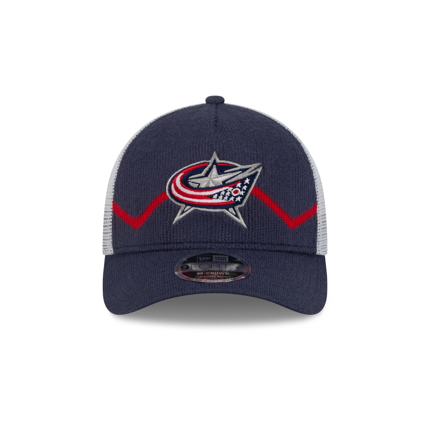 The Columbus Blue Jackets Sock 9FORTY M-Crown A-Frame Trucker features an embroidered Blue Jackets logo at the front panels against a split sock fabrication. Additional details include a snapback closure at a mesh rear.