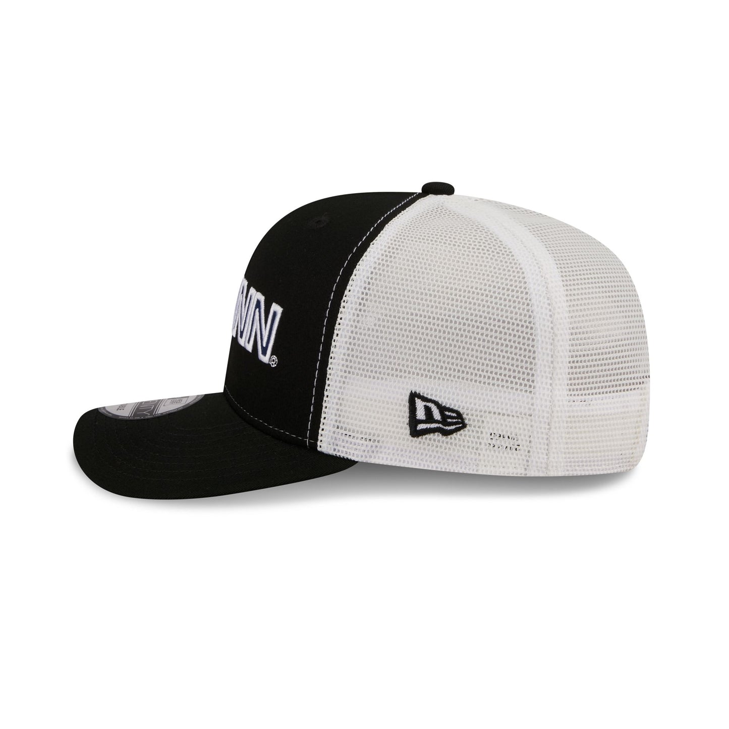The Connecticut Huskies Collegiate Black 9SEVENTY Trucker features an embroidered Huskies logo at the front panels with an adjustable stretch-snap closure at the rear and red patterned undervisor.