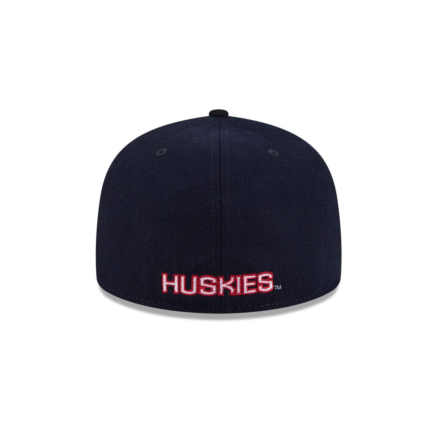 The Connecticut Huskies Melton Wool 59FIFTY Fitted Cap features a chenille applique Huskies logo patch at the front panels with an embroidered team wordmark at the rear and a gray undervisor.