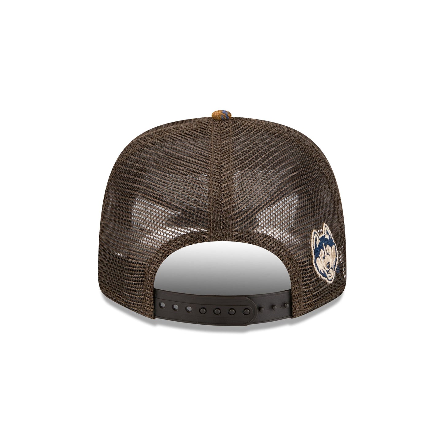The Connecticut Huskies Wool Plaid 9SEVENTY Trucker features an embroidered Huskies badge at the front panels with a matching team logo at the right of an adjustable stretch-snap closure at the rear and a brown undervisor.