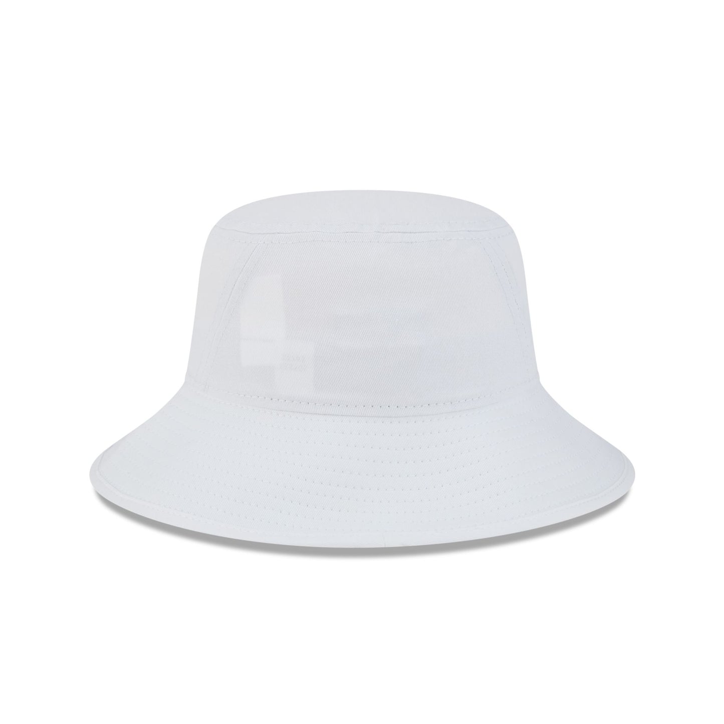 The Connecticut Sun Optic White Bucket Hat features an embroidered Sun logo at the front with a matching New Era Flag at the left-wear side.