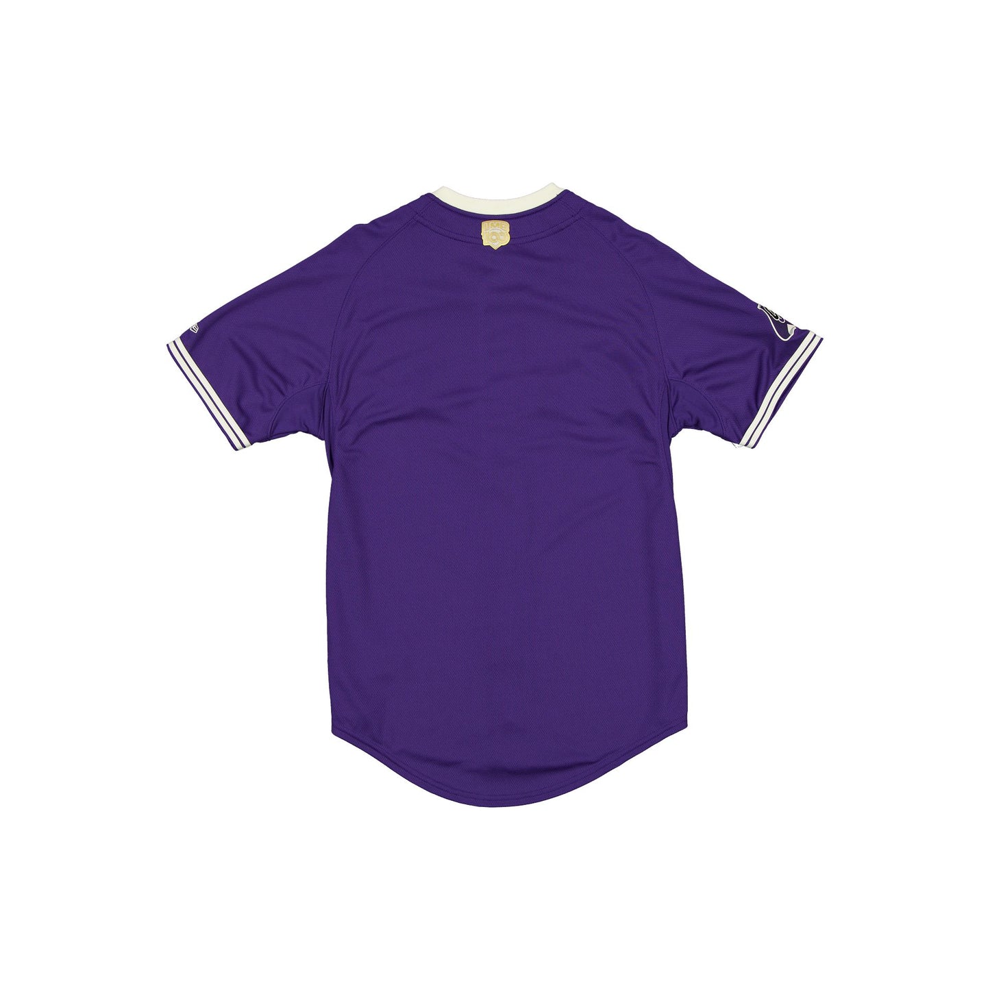 The Conspiradores de Querétaro LMB 100th Anniversary Purple Alt Jersey features an embroidered Conspiradores wordmark at the chest with a New Era Official Merchandise patch at the front hemline, a team logo at the right sleeve, and a LMB 100th Anniversary logo at the rear.