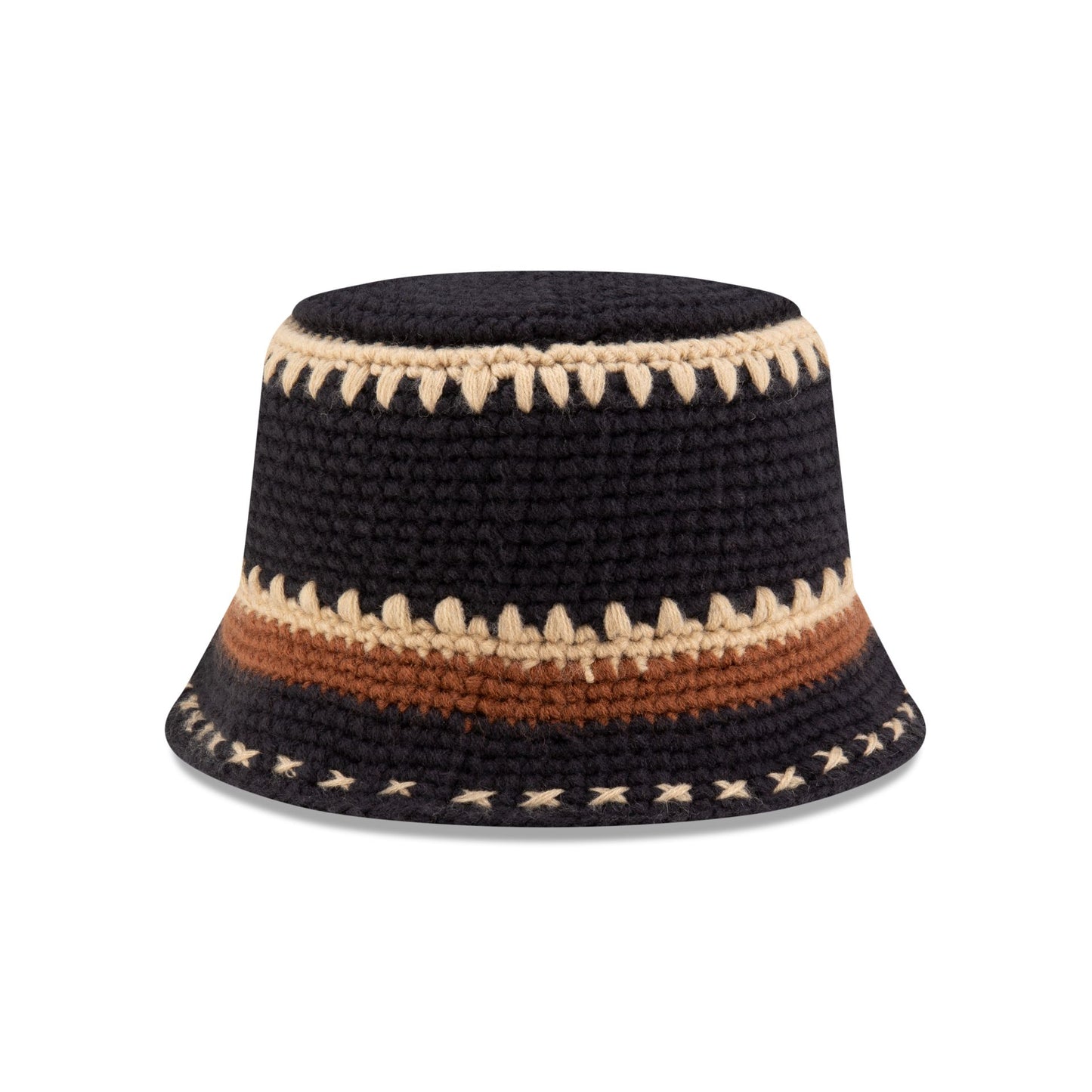 The New Era Cap Crochet Knit Bucket Hat features an embroidered New Era logo at the left-wear side.