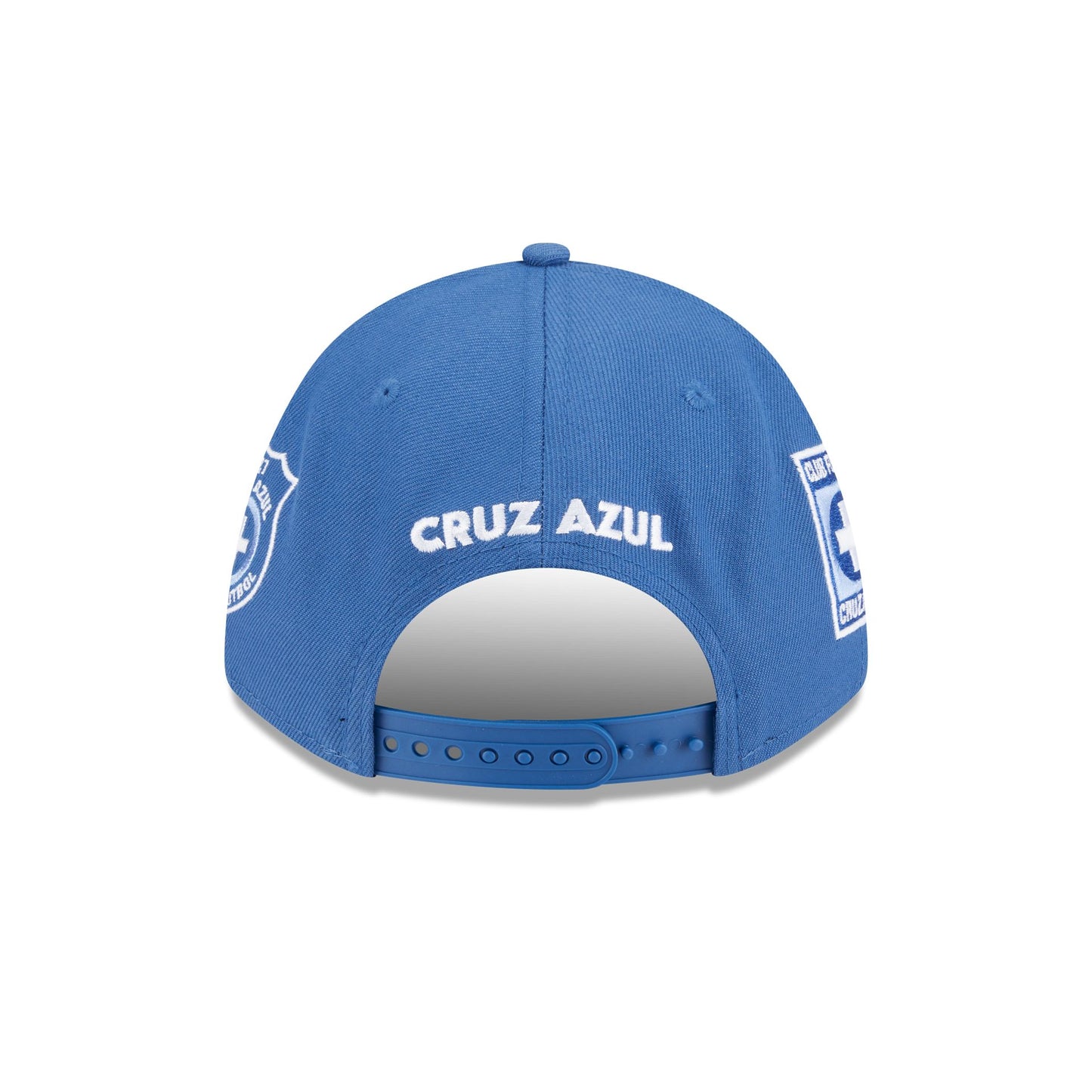 The Cruz Azul Indigo 9FORTY M-Crown A-Frame Trucker features the Cruz Azul primary logo embroidered at the front panel with alternate team logos throughout the crown, a team wordmark above a snapback closure at the rear, and a gray undervisor.