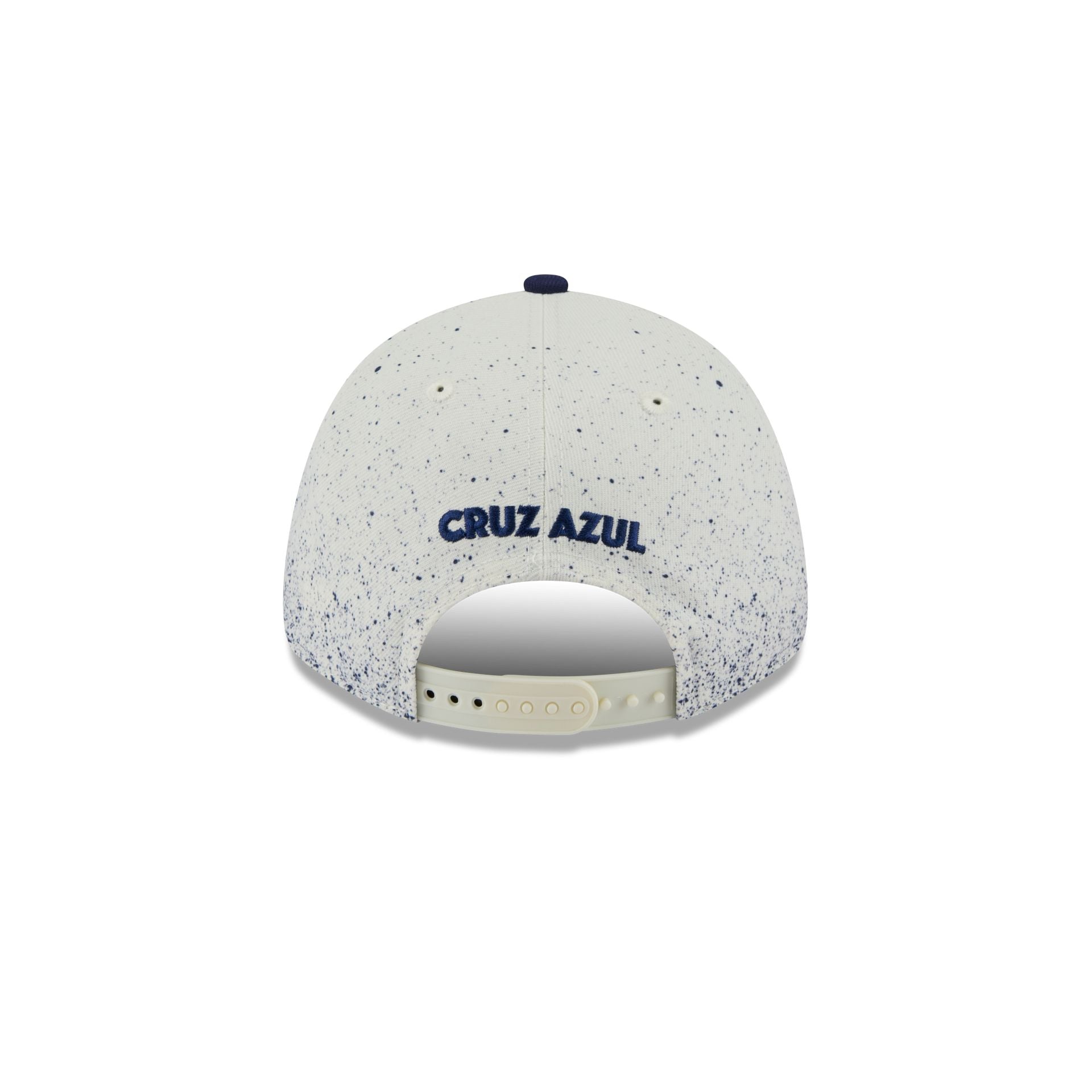 The Cruz Azul Splattered Crown 9FORTY Snapback features an embroidered Cruz Azul logo at the front panels with a team color paint splattered crown. Additional details include a team wordmark above a snapback closure at the rear and a navy undervisor.