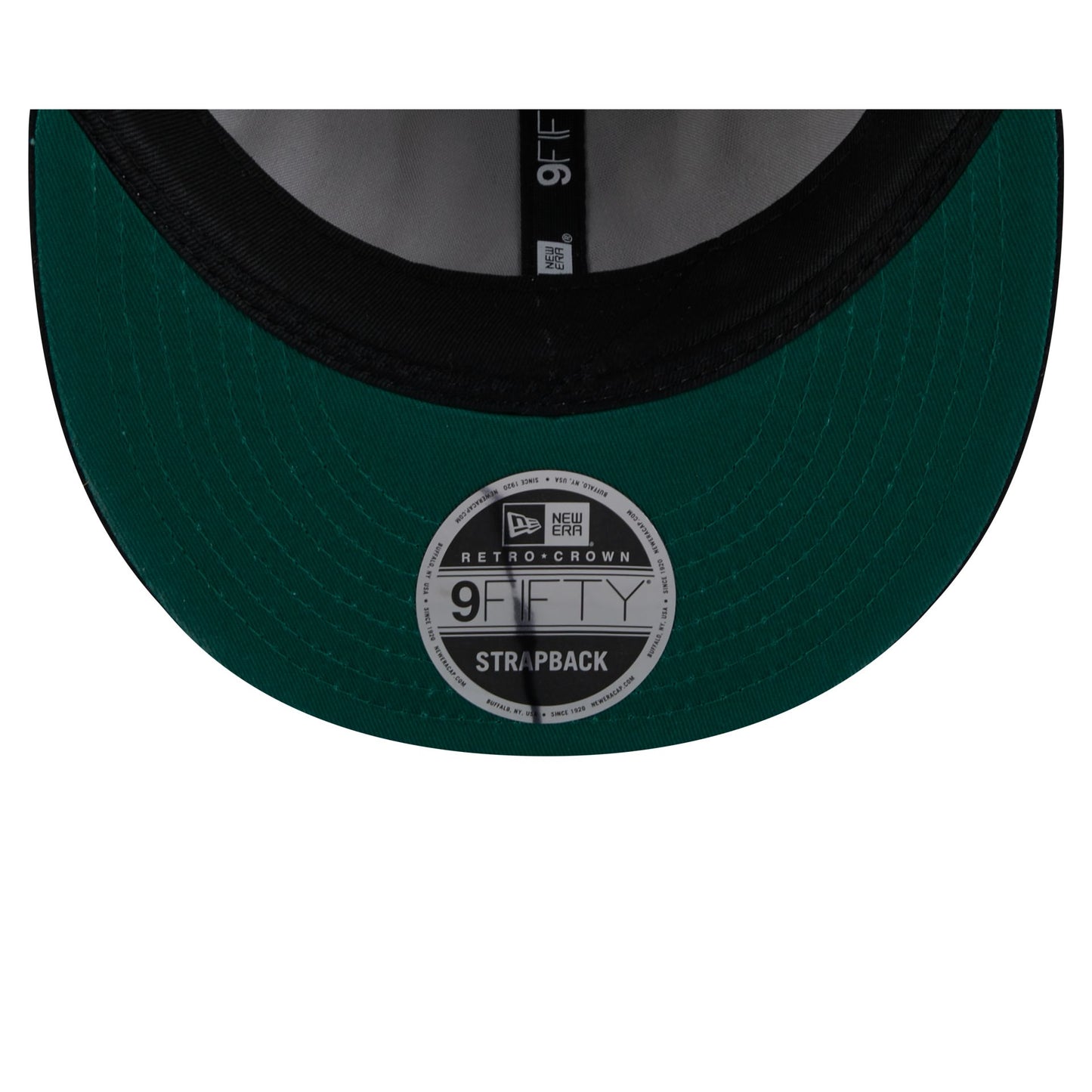 The Cuban X Giants Tri Color Retro Crown 9FIFTY Snapback features an embroidered Giants tricolor logo at the front panels with a Negro Leagues Baseball Museum patch at the right-wear side. Additional details include an adjustable leather closure at the rear and a green undervisor.