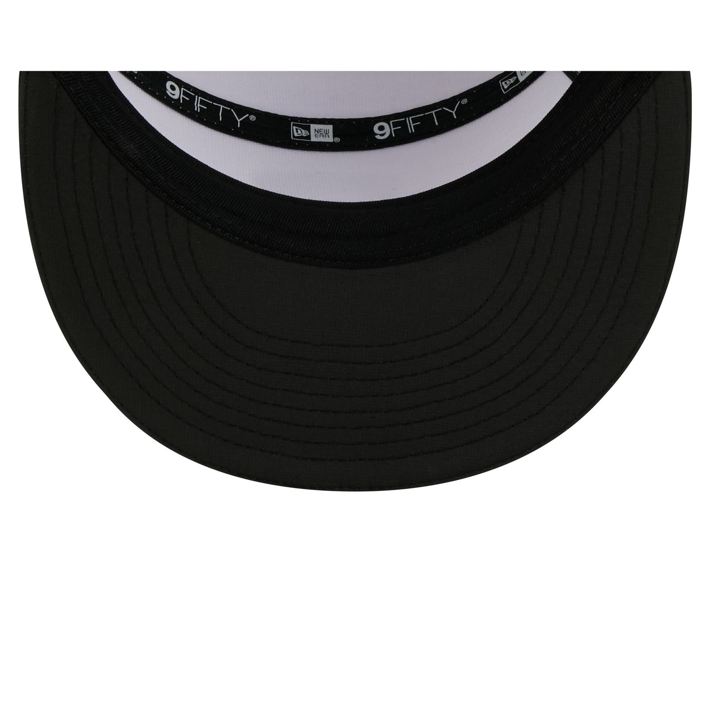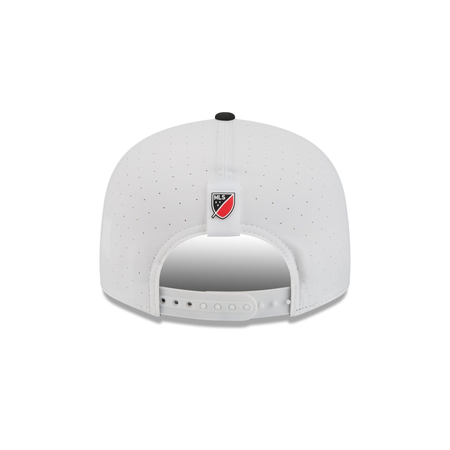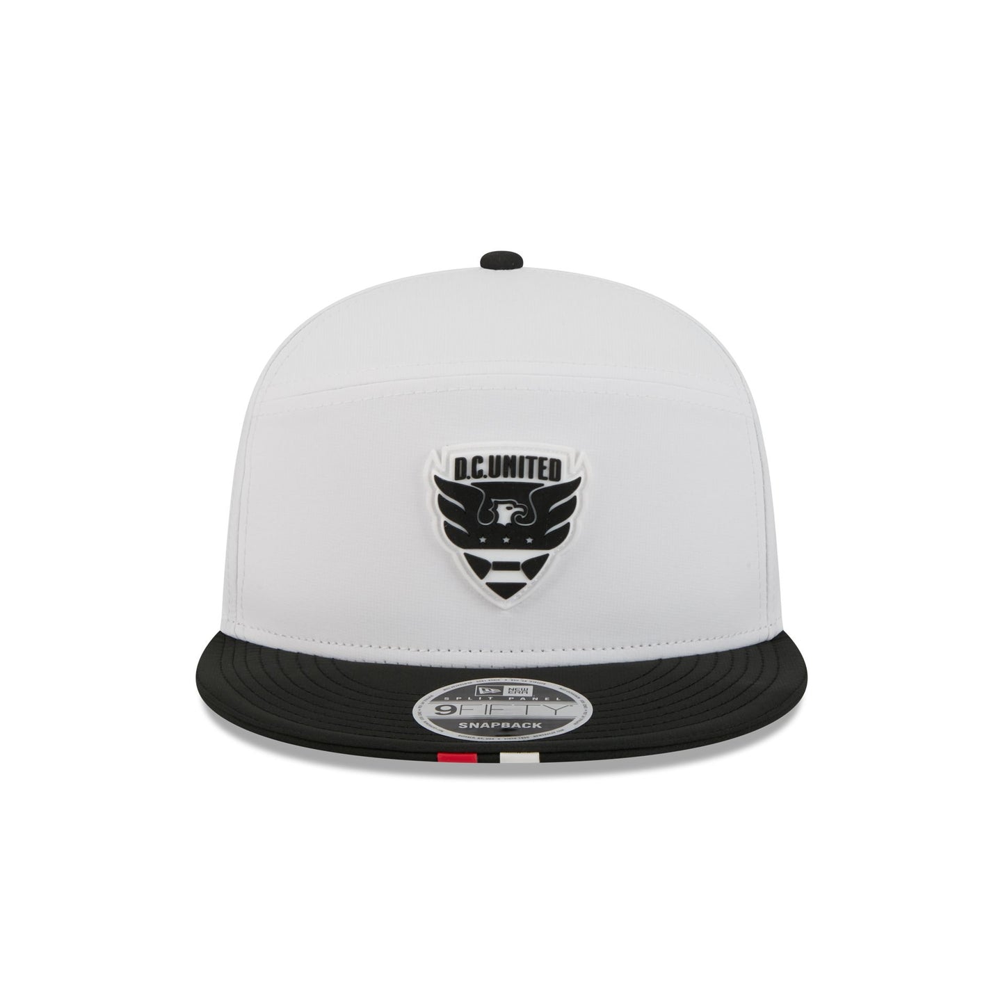 The D.C. United 2026 MLS Kickoff Split Panel 9FIFTY Snapback features a stitch-down silicone D.C. United logo patch at the front panel with a matching woven MLS Shield tag above a snapback closure at the rear. Additional details include a quill tech performance fabrication with a black visor accented with team color stripes at the front.