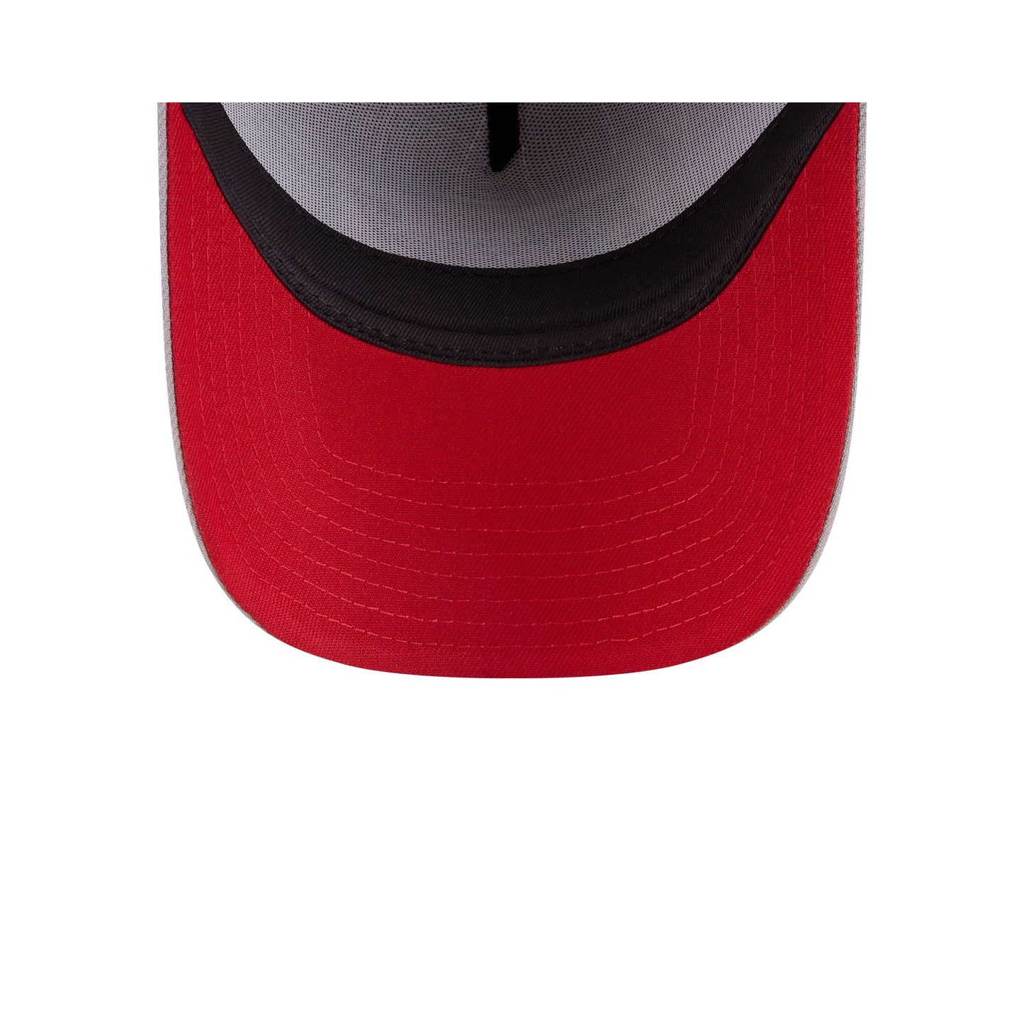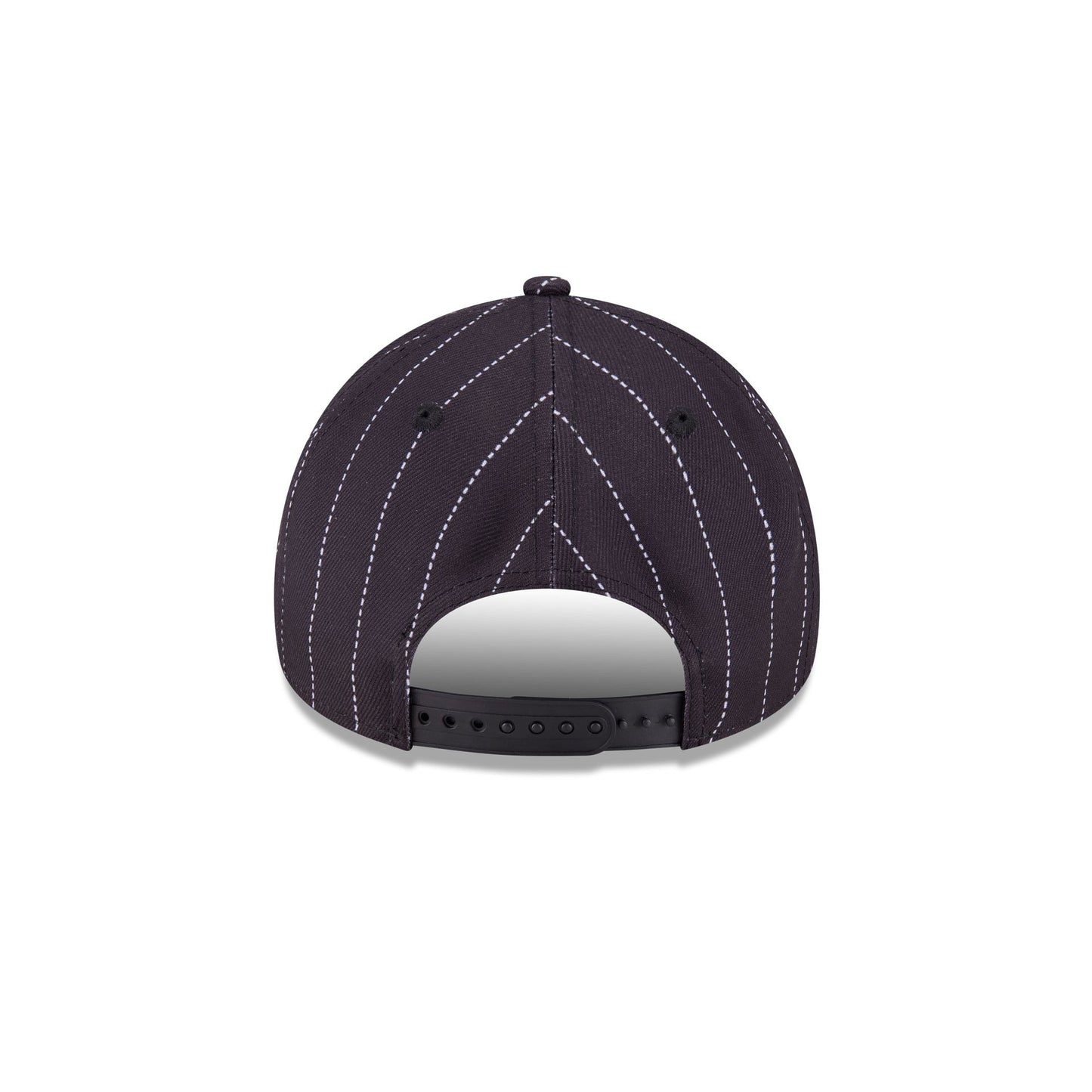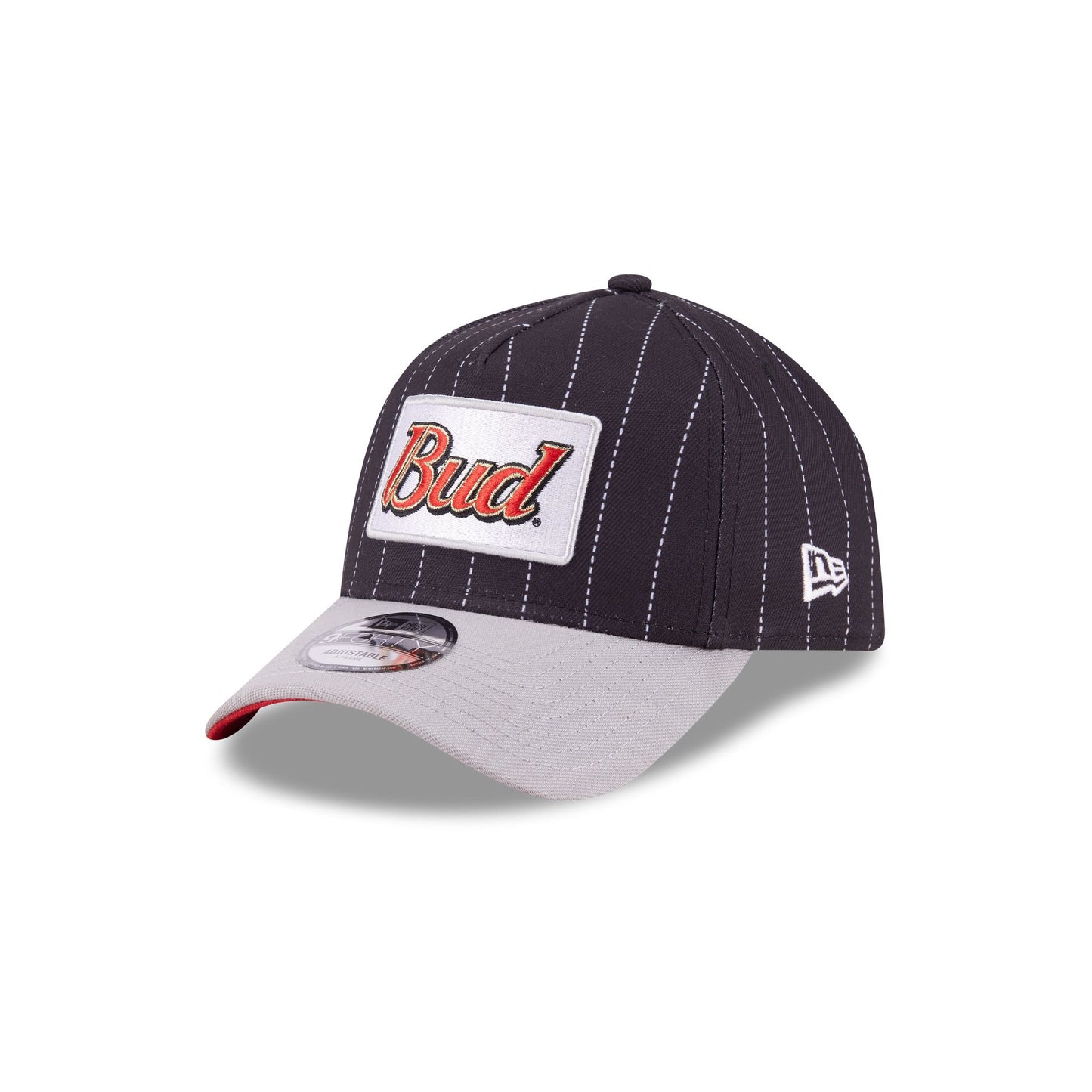 The Dale Earnhardt Jr. x Budweiser Pinstripe 9FORTY A-Frame Snapback features an embroidered Budweiser patch at the front with a Dale Jr. number 8 at the right-wear side, a gray visor, and a red undervisor.