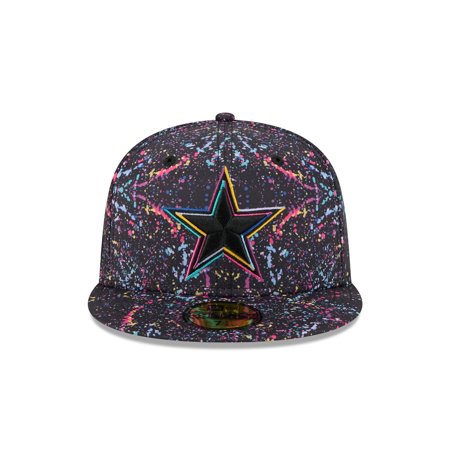 The Dallas Cowboys 2025 Crucial Catch 59FIFTY Fitted Cap features an embroidered Cowboys logo at the front paint splatter panels with an NFL Shield at the rear, a Crucial Catch Intercept Cancer patch at the right-wear side, and a black undervisor.