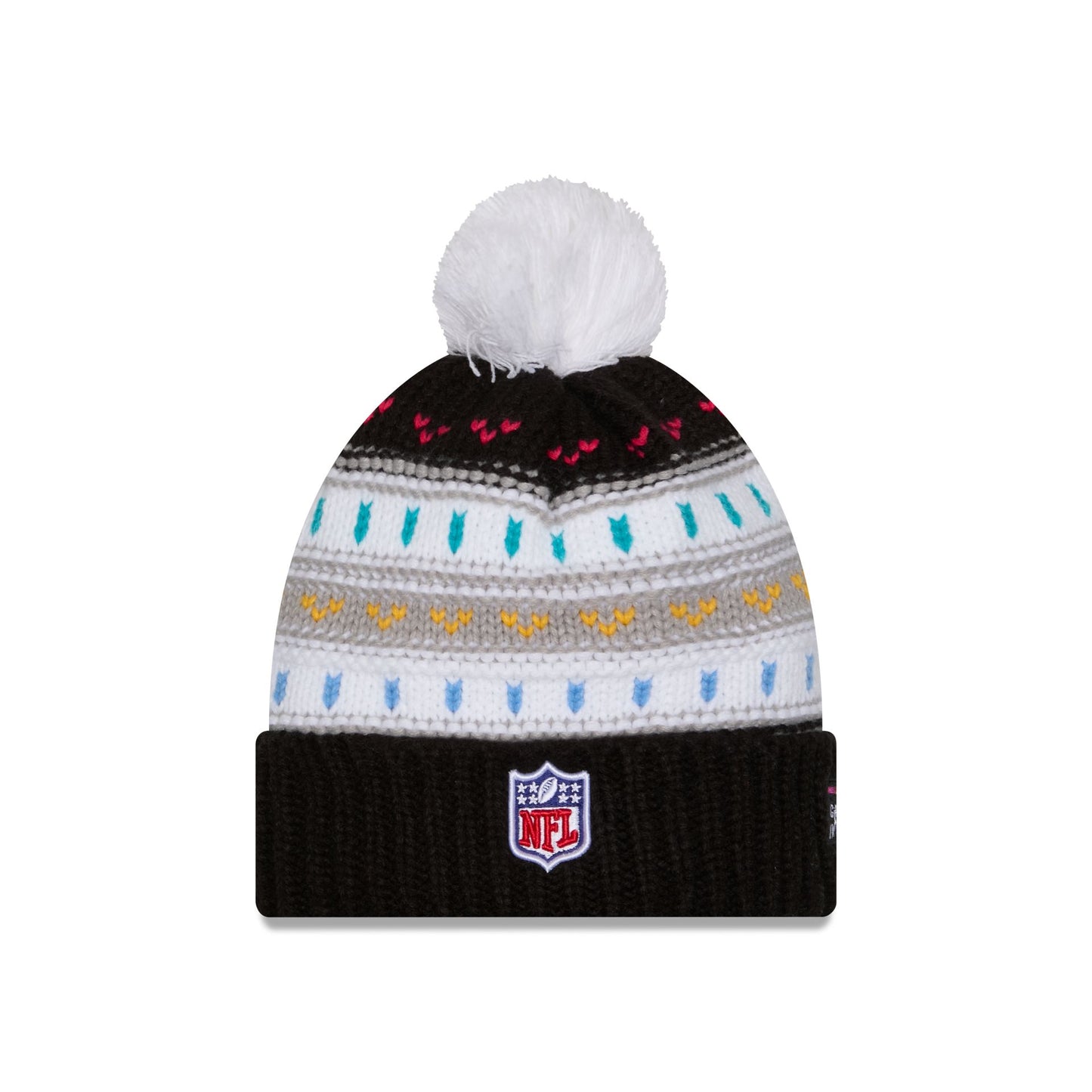 The Dallas Cowboys 2025 Crucial Catch Women's Pom Knit features an embroidered Cowboys logo at the front with an NFL Shield at the rear, a Crucial Catch Intercept Cancer patch at the right-wear side, and a one-time removeable pom.