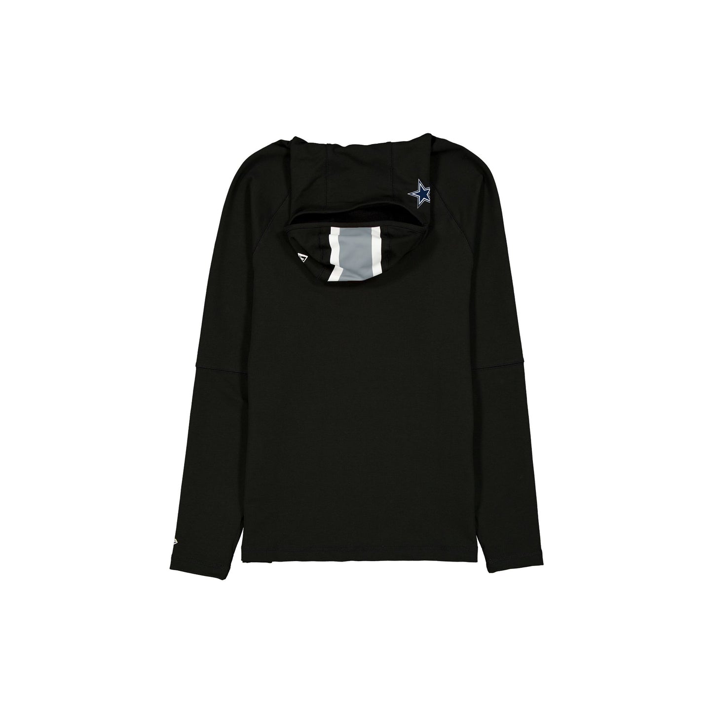 The Dallas Cowboys 2025 Functional Fandom Black Balaclava Hoodie features a screen-printed Cowboys graphic at the chest with a matching logo and helmet stripe at the hood and an Official NFL Combine Authentic patch at the left hip. Additional details include moisture-wicking and antimicrobial fabric.