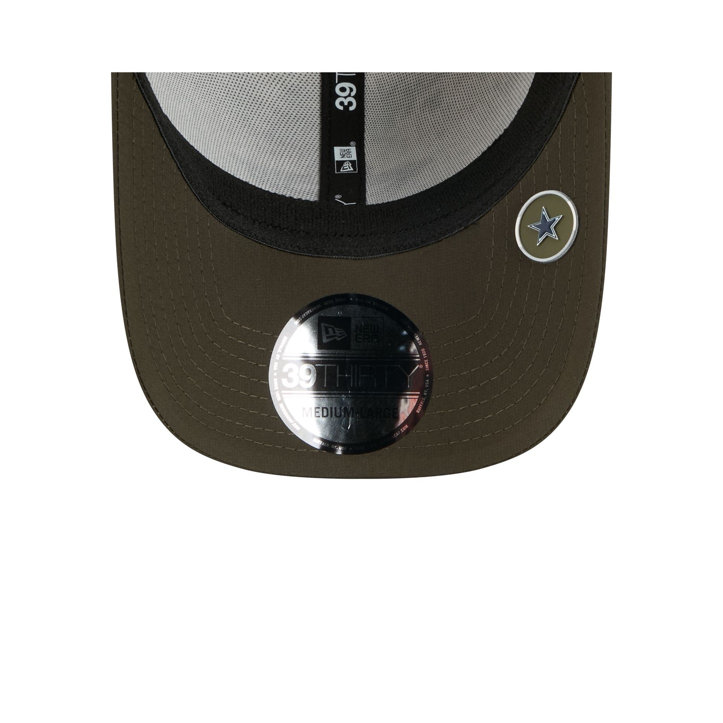 The Dallas Cowboys 2025 Salute to Service Digi Camo 39THIRTY Stretch Fit Cap features an embroidered Cowboys logo at the front panels with the official NFL Salute to Service patch at the rear and American flag patch at the right-wear side. Additional details include three green stripes at the visor and a silicone team logo patch at a dark green undervisor..