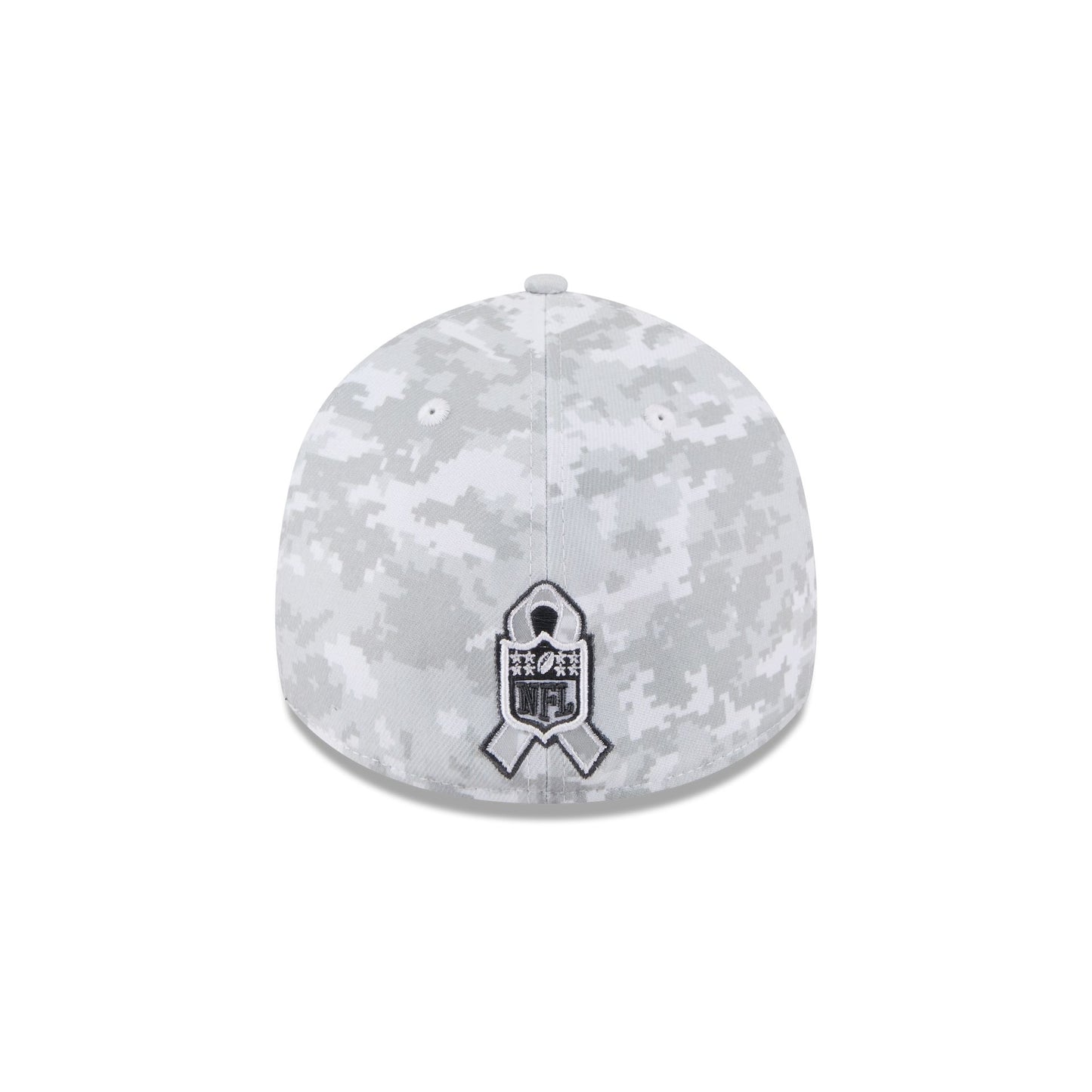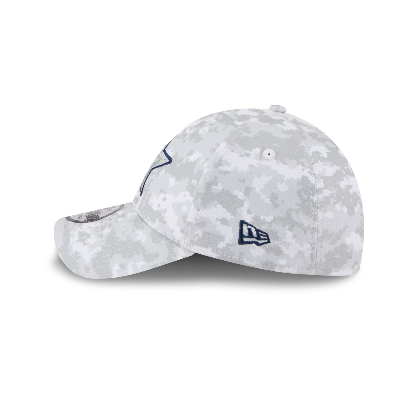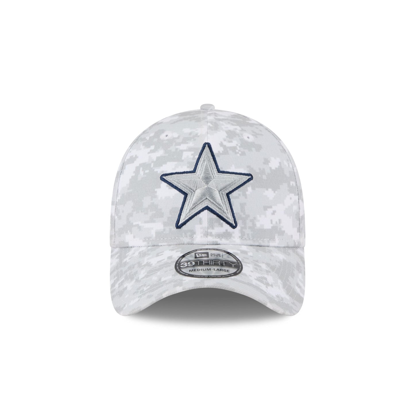The Dallas Cowboys 2025 Salute to Service Fan Gear 39THIRTY Stretch Fit Cap features an embroidered Cowboys logo at the front panels with the official NFL Salute to Service patch at the rear, an American flag patch at the right-wear side, and a team color undervisor.