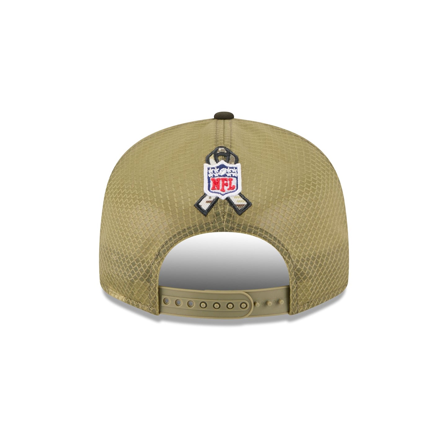 The Dallas Cowboys 2025 Salute to Service Split Panel 9FIFTY Trucker features an embroidered Cowboys logo at the front panels with the official NFL Salute to Service patch above a snapback closure at the rear. Additional details include an American flag patch at the right-wear side with a silicone team logo patch at a dark green undervisor and a digi camo interior fabrication.