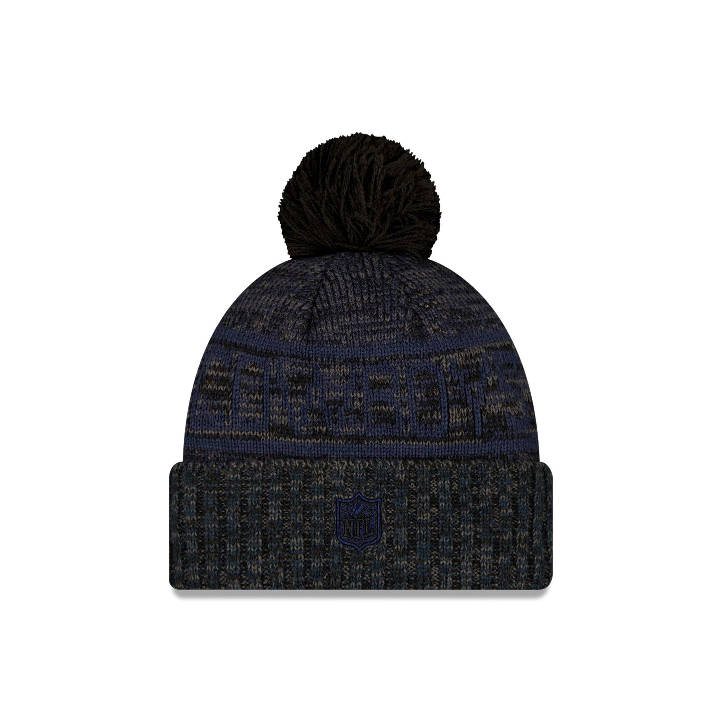 The Dallas Cowboys 2025 Sideline Cold Weather Black Pom Knit Hat features a sewn-down silicone Cowboys black logo patch at the front cuff with a matching Official NFL Shield logo at the rear. Additional details include a team wordmark across the crown, a one-time removeable black pom, and a fleece lining.