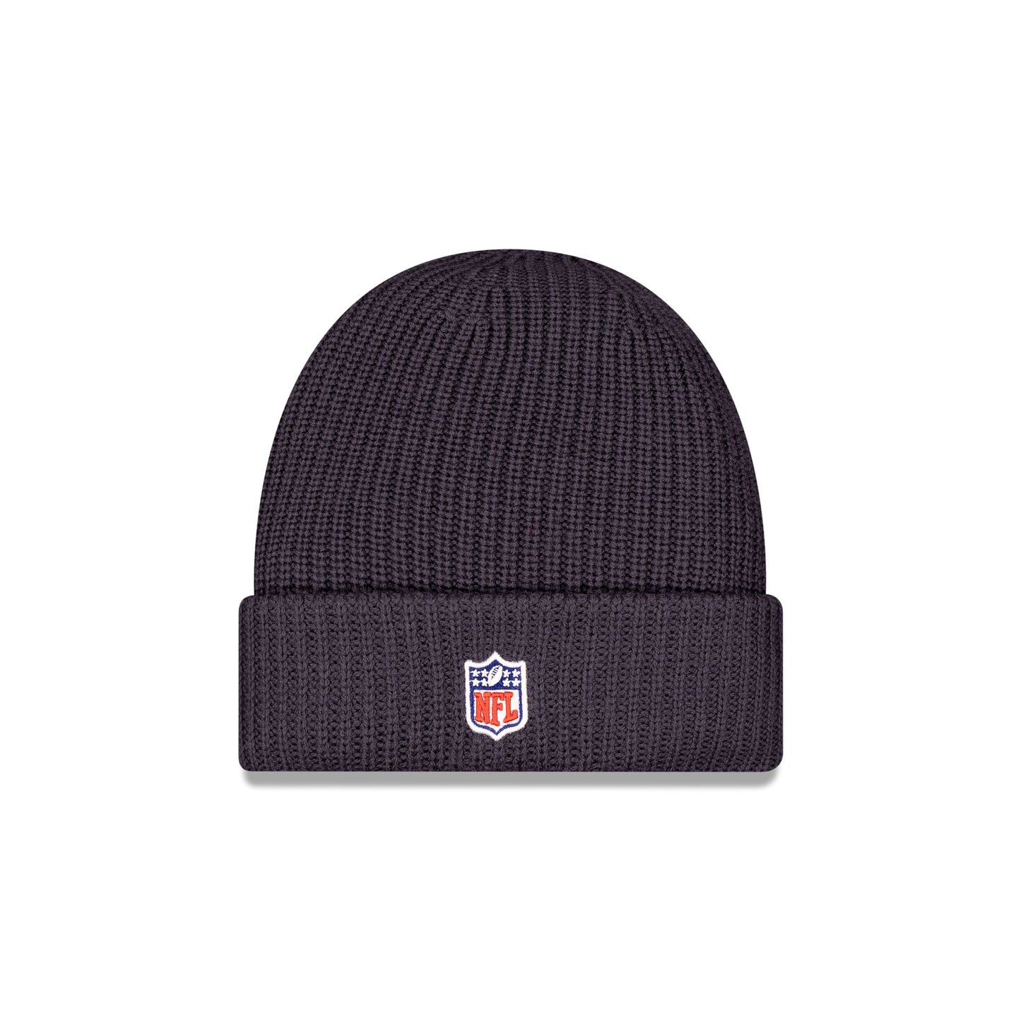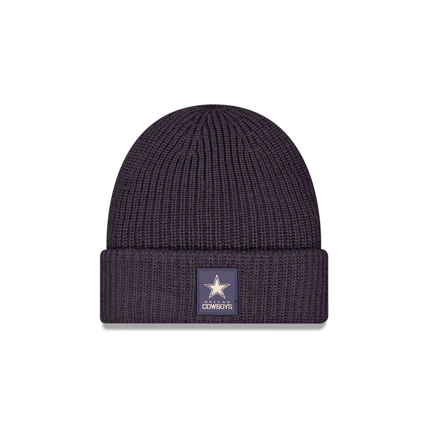 The Dallas Cowboys 2025 Sideline Cold Weather Steel Clouds Cuff Knit Beanie features a sewn-down silicone Cowboys logo patch at the front cuff with a matching Official NFL Shield logo at the rear. The beanie is knit from wool yarn and lined with fleece.
