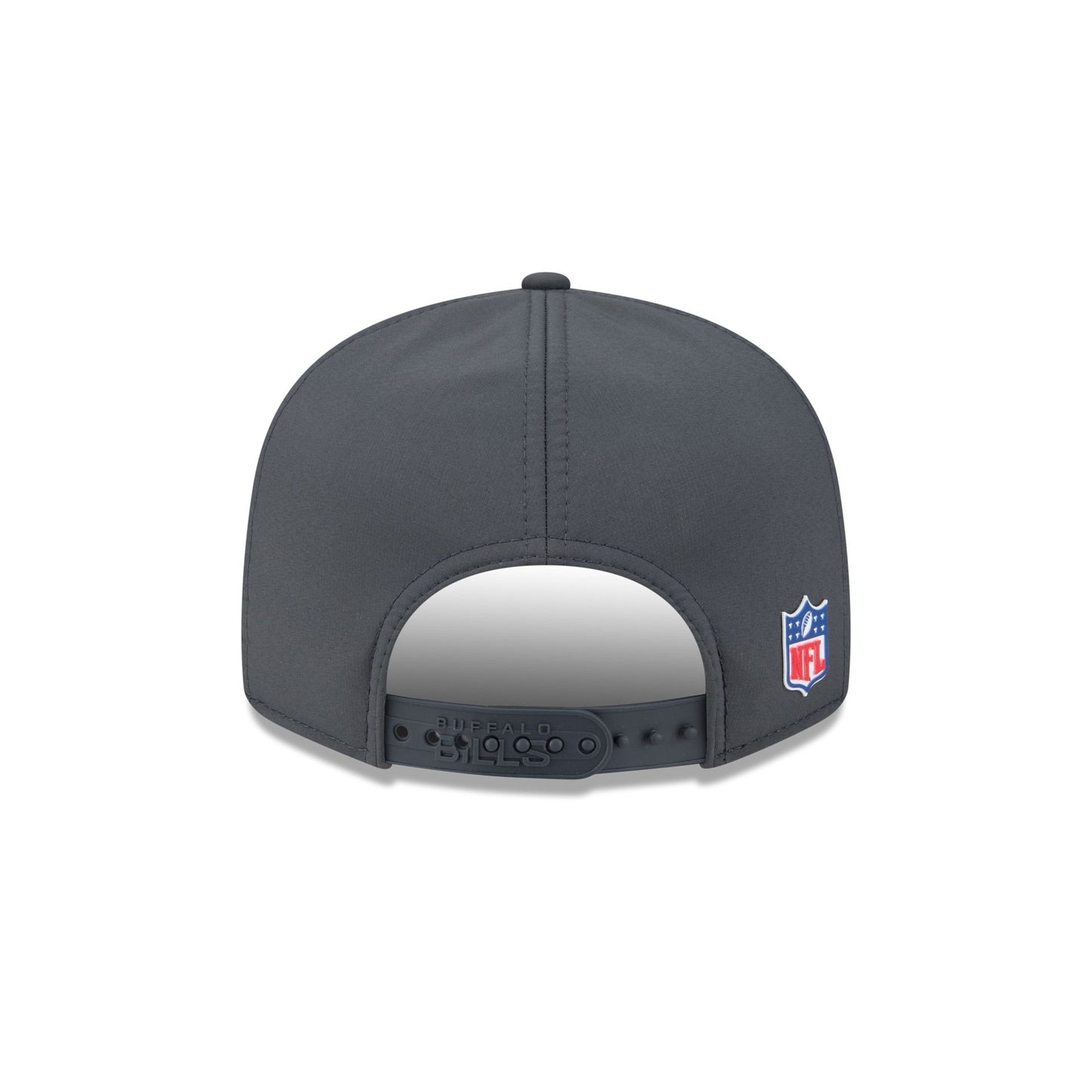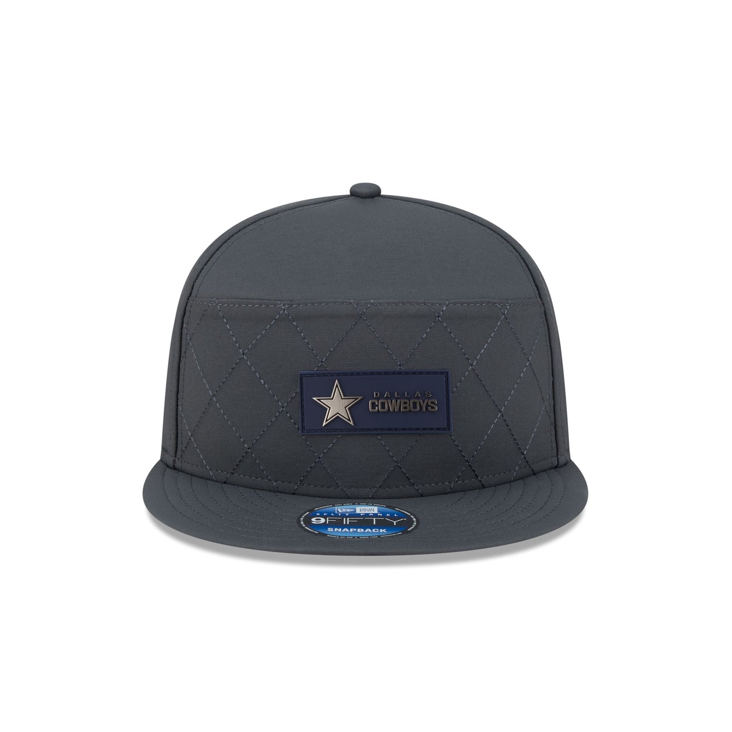 The Dallas Cowboys 2025 Sideline Cold Weather Steel Clouds Split Panel 9FIFTY Snapback features a sewn-down silicone Cowboys logo patch at the front panels with a split-crown construction and diamond quilting. The cap has a water-repellent quill tech fabrication throughout, with a quick-dry cushioned sweatband to absorb moisture. Additional details include the Official NFL Shield logo to the right of a soft silicone snapback closure at the rear with eyelets at each side panel. The undervisor is accented with a silicone transfer in the team’s colors.