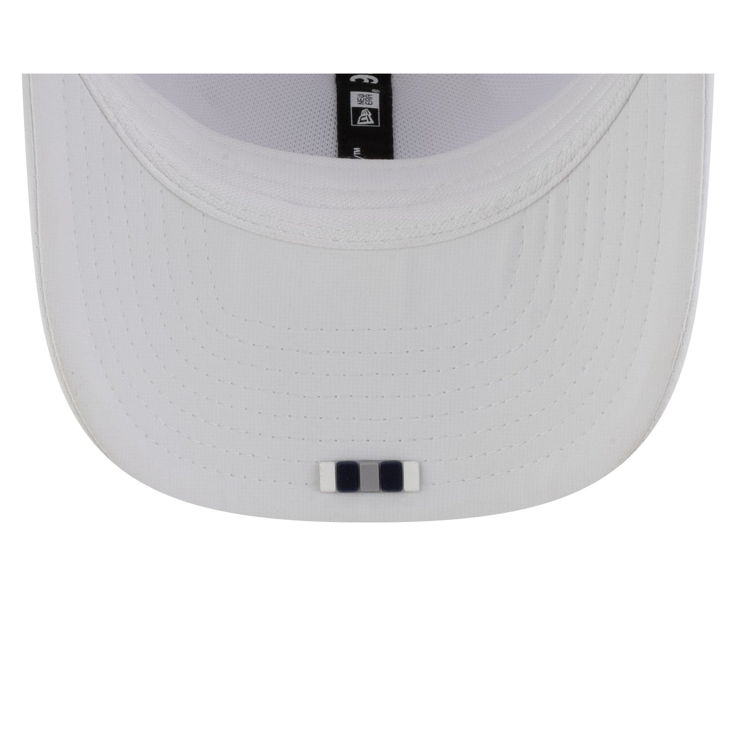 The Dallas Cowboys 2025 Sideline Hot Weather White 9SEVENTY Trucker features a sewn-down silicone Cowboys logo patch at the front panels with a water-repellent quill tech fabrication throughout and a quick-dry cushioned sweatband to absorb moisture. Additional details include the Official NFL Shield logo to the right of a soft silicone snapback closure at a light-weight mesh rear. The undervisor is accented with a silicone transfer in the team’s colors.
