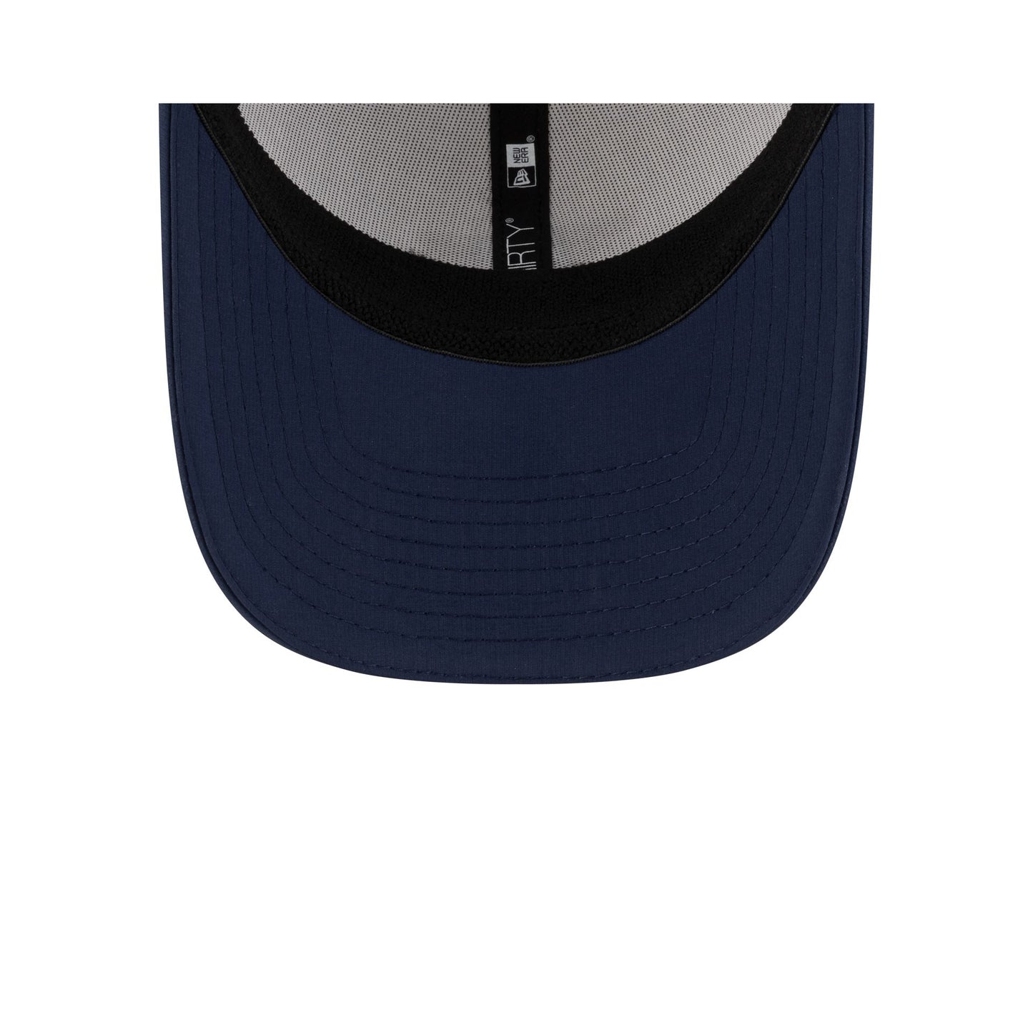 The Dallas Cowboys 2025 Training 39THIRTY Stretch Fit Cap features a silicone Cowboys patch at the front panels with team color stripes at the front of a navy visor and a silicone NFL Shield patch at the rear.