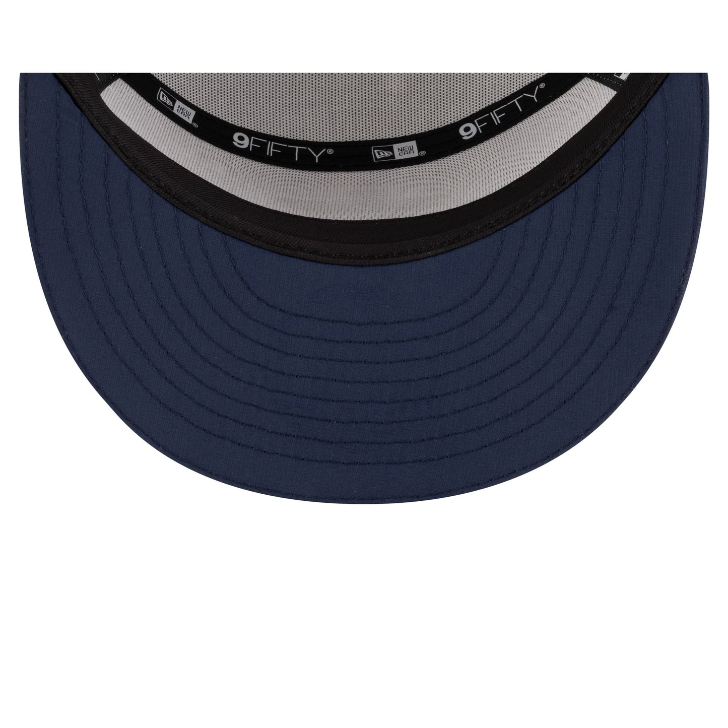 The Dallas Cowboys 2025 Training Split Panel 9FIFTY Snapback features a silicone Cowboys patch at the front panel with team color stripes at the front of a navy visor. Additional details include a silicone NFL Shield patch on a woven foldover tab above a snapback closure at the rear.