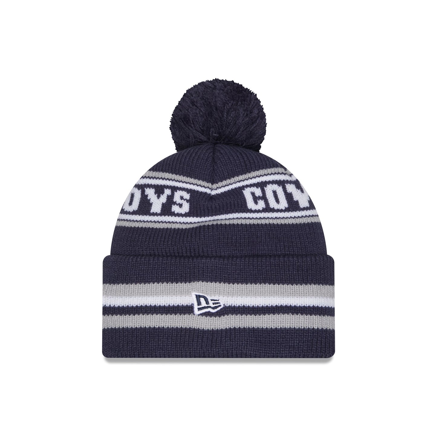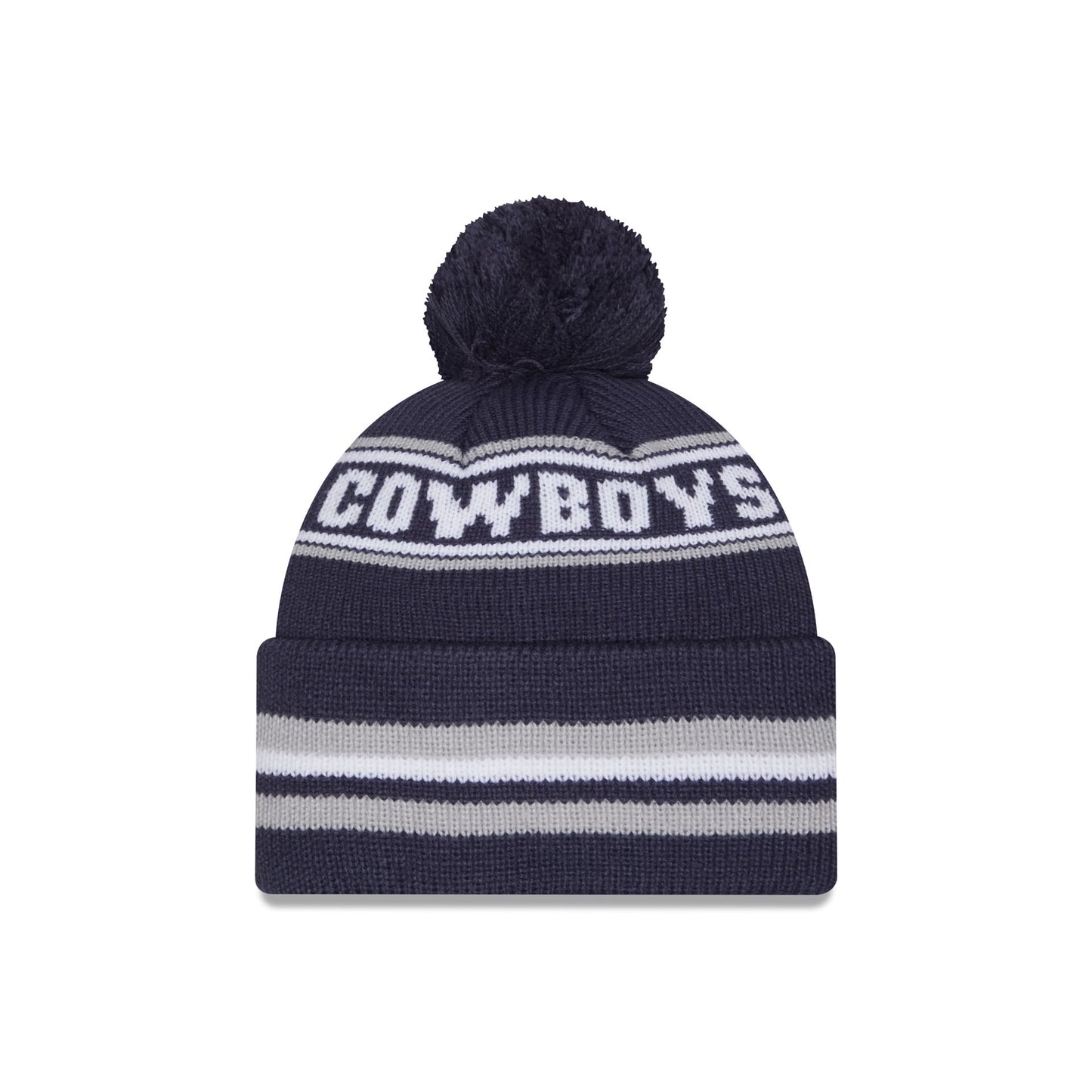 The Dallas Cowboys Classic Pom Knit Hat features an embroidered Cowboys logo at the front cuff with a wordmark at the crown and a one-time removable pom.