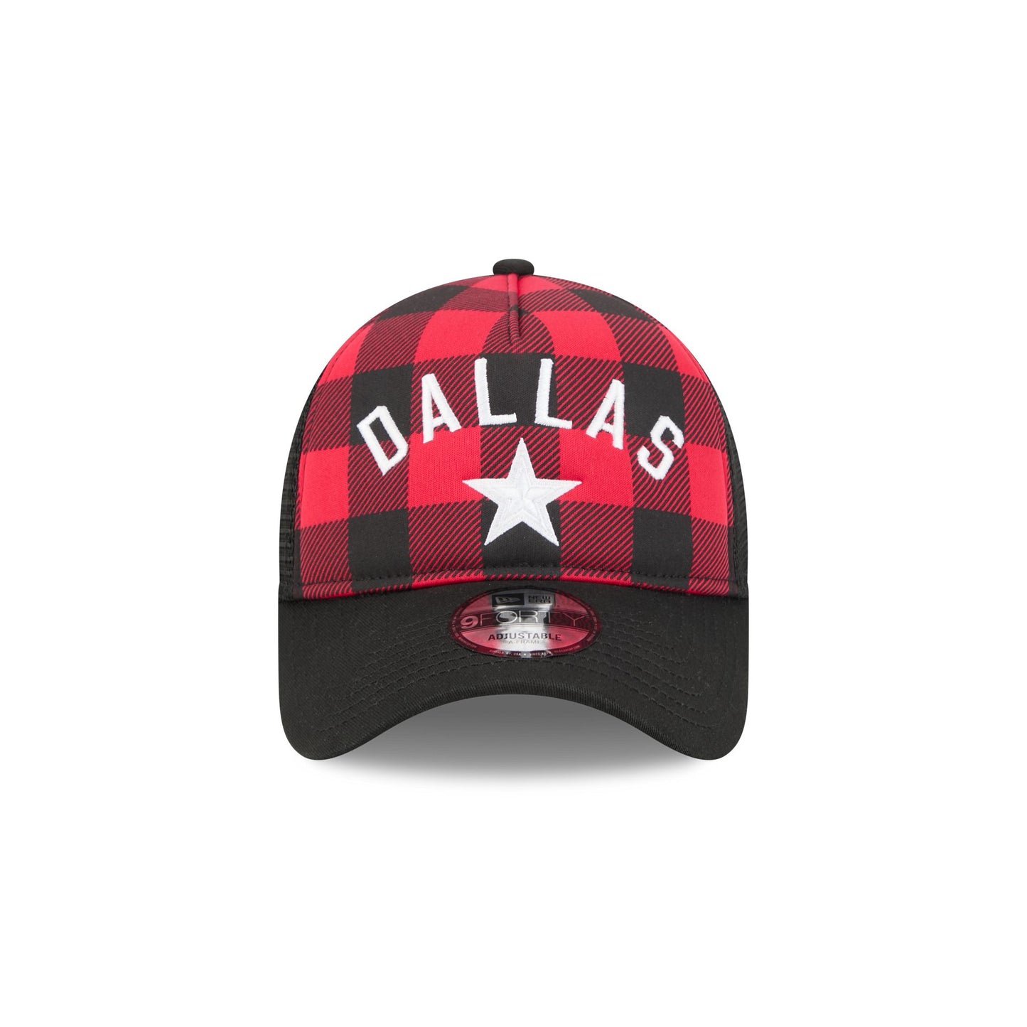 The Dallas Cowboys Evergreen Check 9FORTY A-Frame Trucker features an embroidered Cowboys white wordmark and logo at a checkered plaid front panel. Additional details include an adjustable snapback closure at a mesh rear.