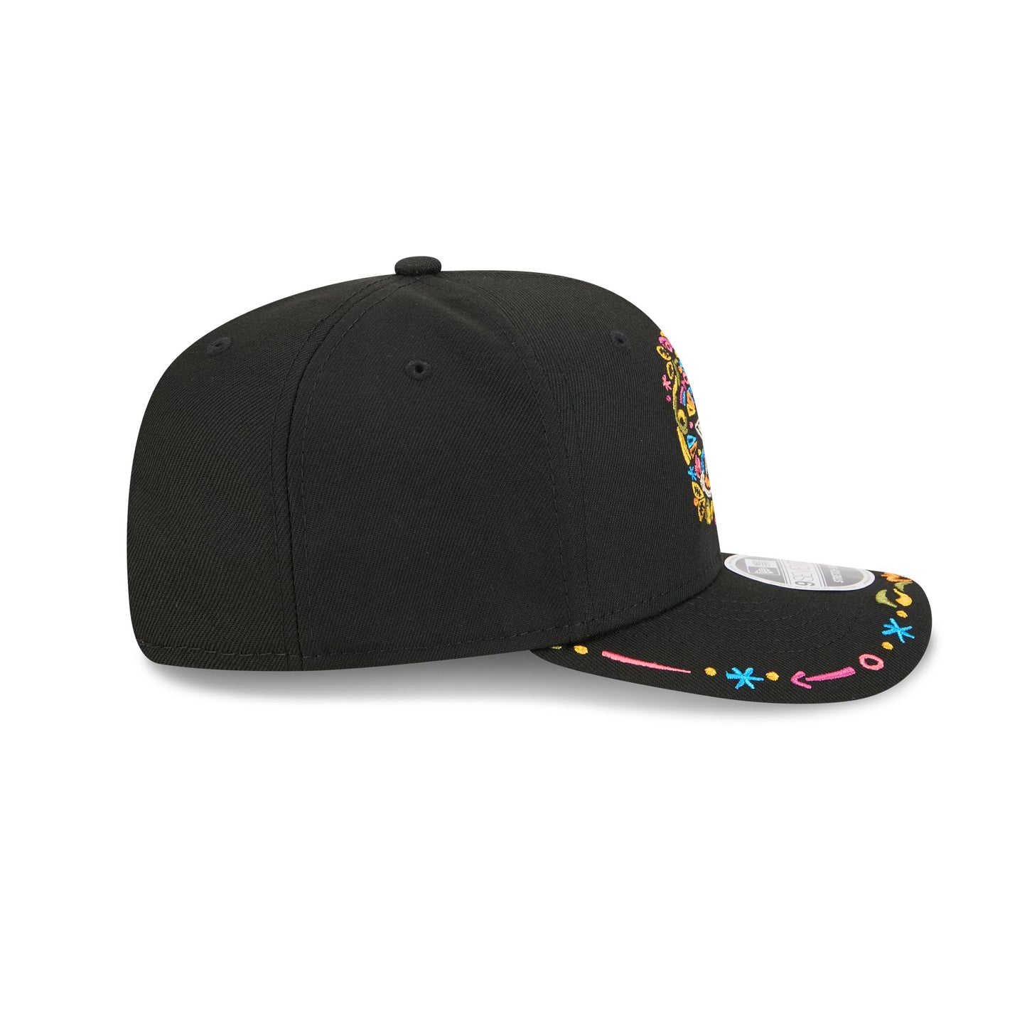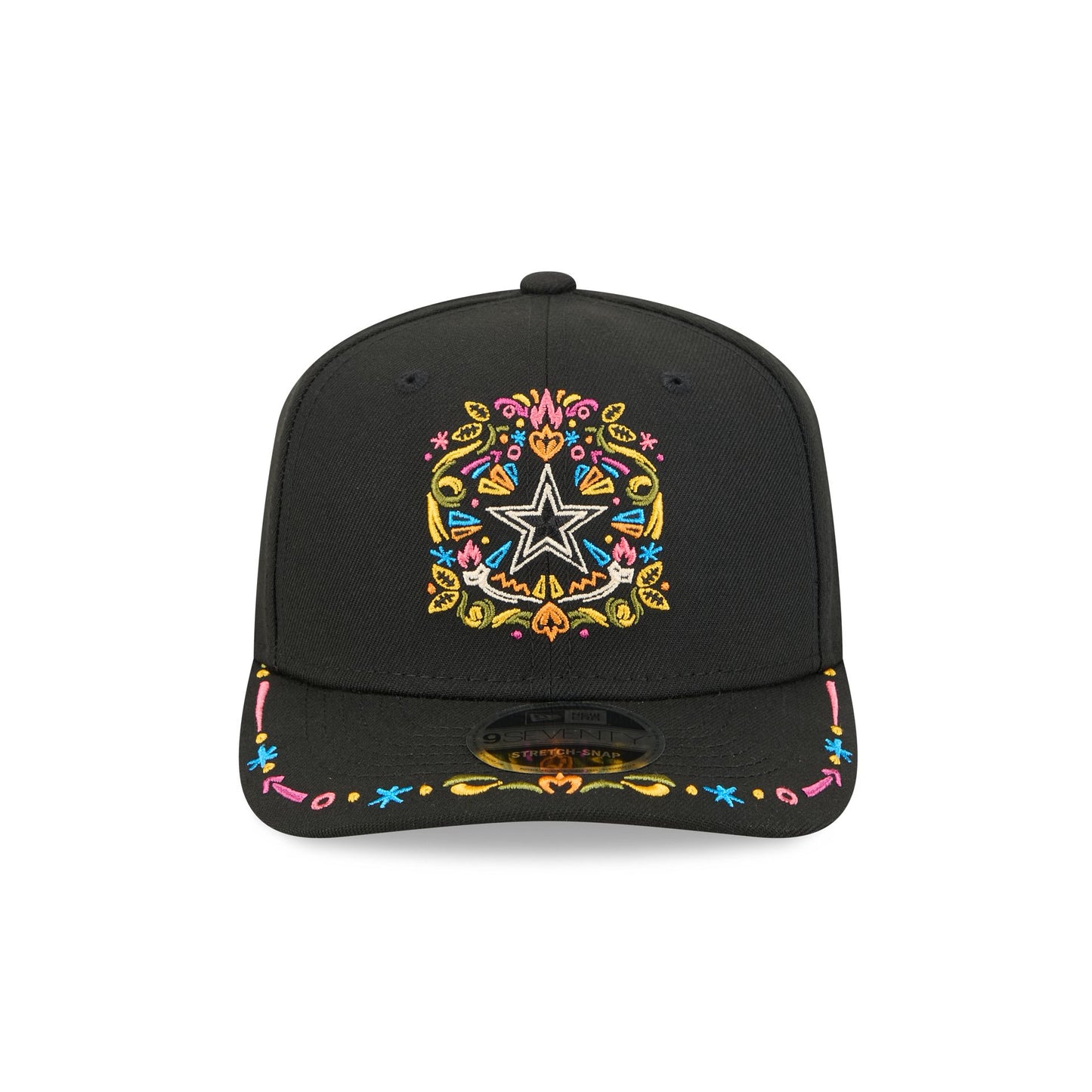The Dallas Cowboys Hasta La Muerte 9SEVENTY Stretch-Snap features an embroidered Cowboys logo and Day of the Dead design at the front panels. Additional details include design at the visor, and an undervisor that reads: Tradición, Corazón y Legado, meaning Tradition, Heart and Legacy. A matching NFL Shield is shown at the rear with an adjustable snapback closure.