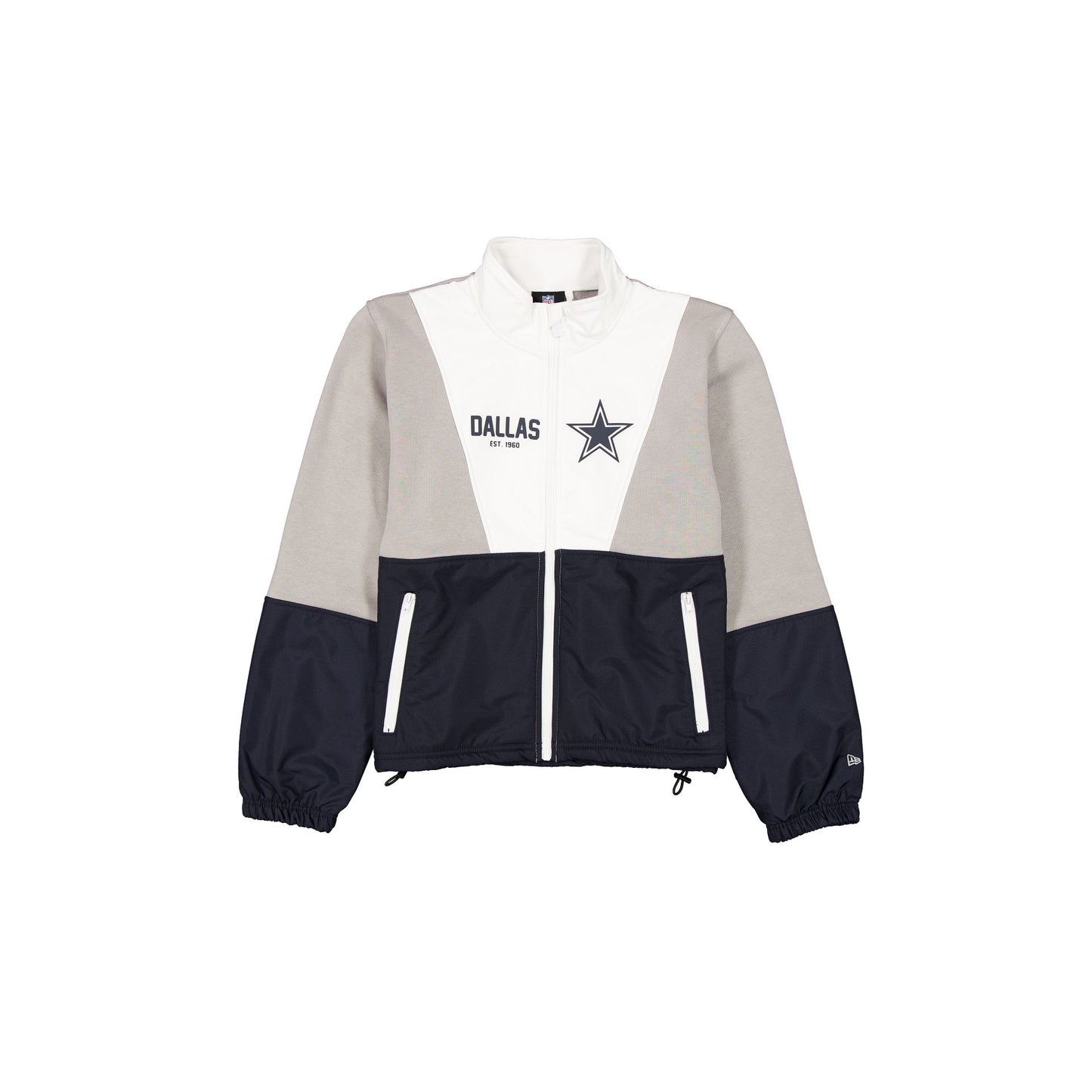 The Dallas Cowboys Leisure Women's Full-Zip Sweatshirt features a screen-printed Cowboys logo at the left chest and wordmark at the right. Additional details include a zipper closure, zipper pockets, and adjustable drawstrings at the waist.