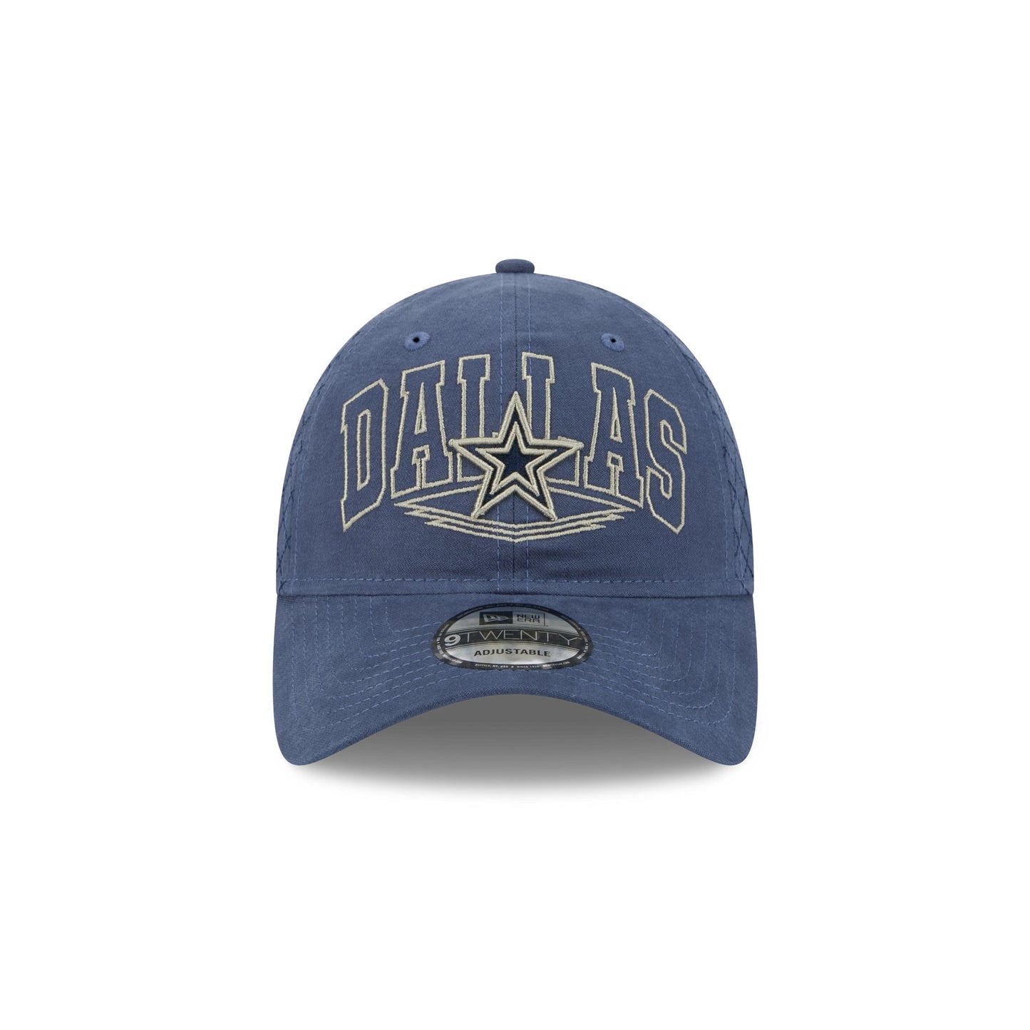 The Dallas Cowboys Quilted Wordmark 9TWENTY Adjustable Cap features an embroidered Cowboys wordmark above a team logo at the front panels with a woven team logo tag at an adjustable D-Ring closure at the rear and a diamond quilted, brushed cotton all over fabrication.