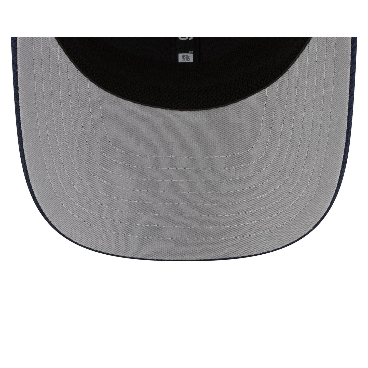 The Dallas Cowboys Team 9SEVENTY Trucker features an embroidered Cowboys logo at the front panels with a matching NFL Shield logo above an adjustable snapback closure at a mesh rear and a gray undervisor.