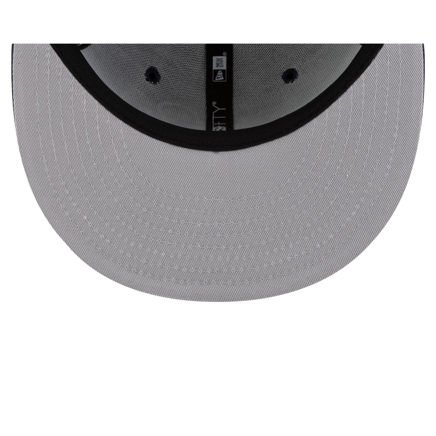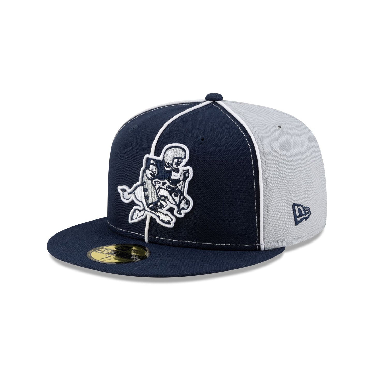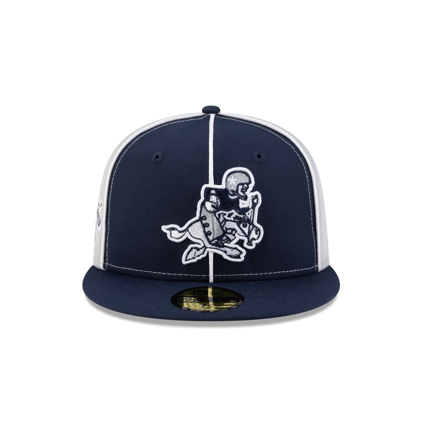 The Dallas Cowboys Two-Tone Pinwheel 59FIFTY Fitted Cap features an embroidered Cowboys Historic logo at the front panels with a matching team wordmark at the rear. Additional details include a blue and gray paneled crown with a 50th Anniversary patch at the right-wear side and a gray undervisor.