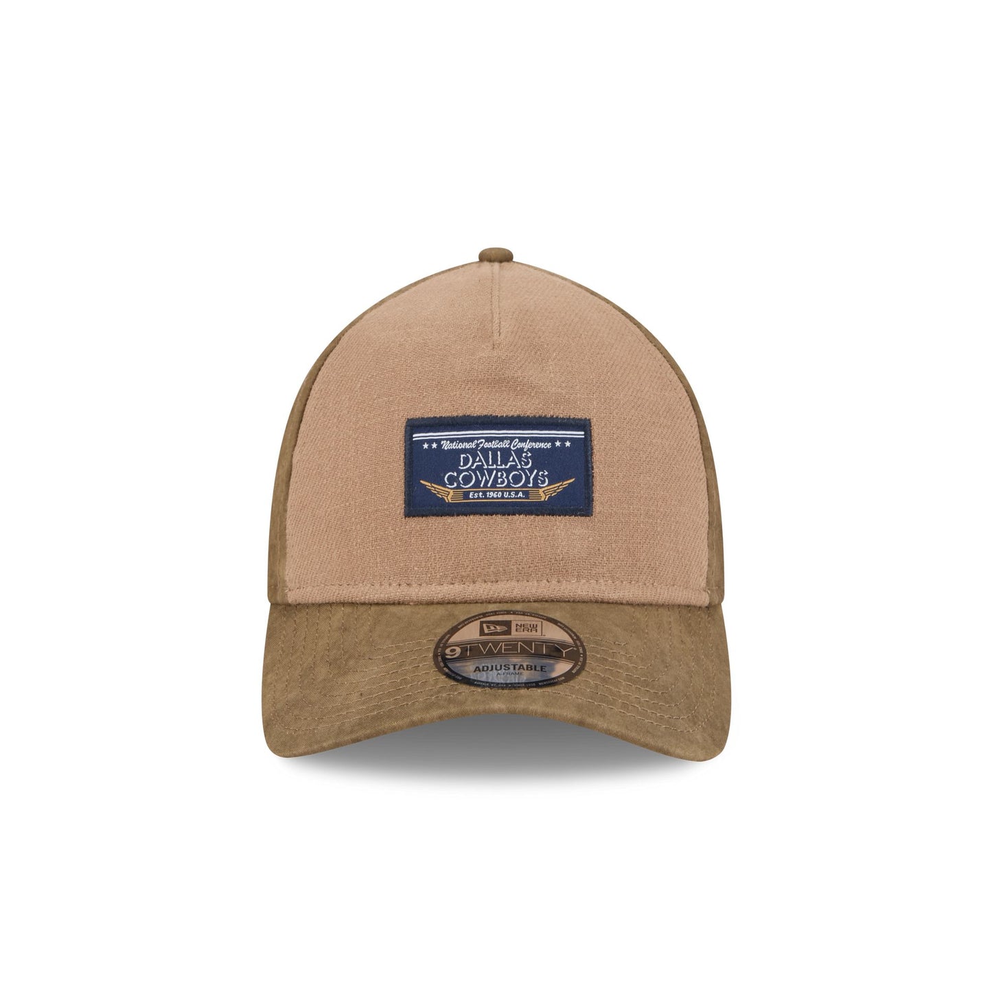 The Dallas Cowboys Utility Linen 9TWENTY A-Frame Adjustable Cap features a woven Cowboys tag at the front panels against a linen fabrication with a team logo at the right-wear side. Additional details include the state or city flag sublimation at the interior of the cap and an adjustable D-Ring closure at the rear.