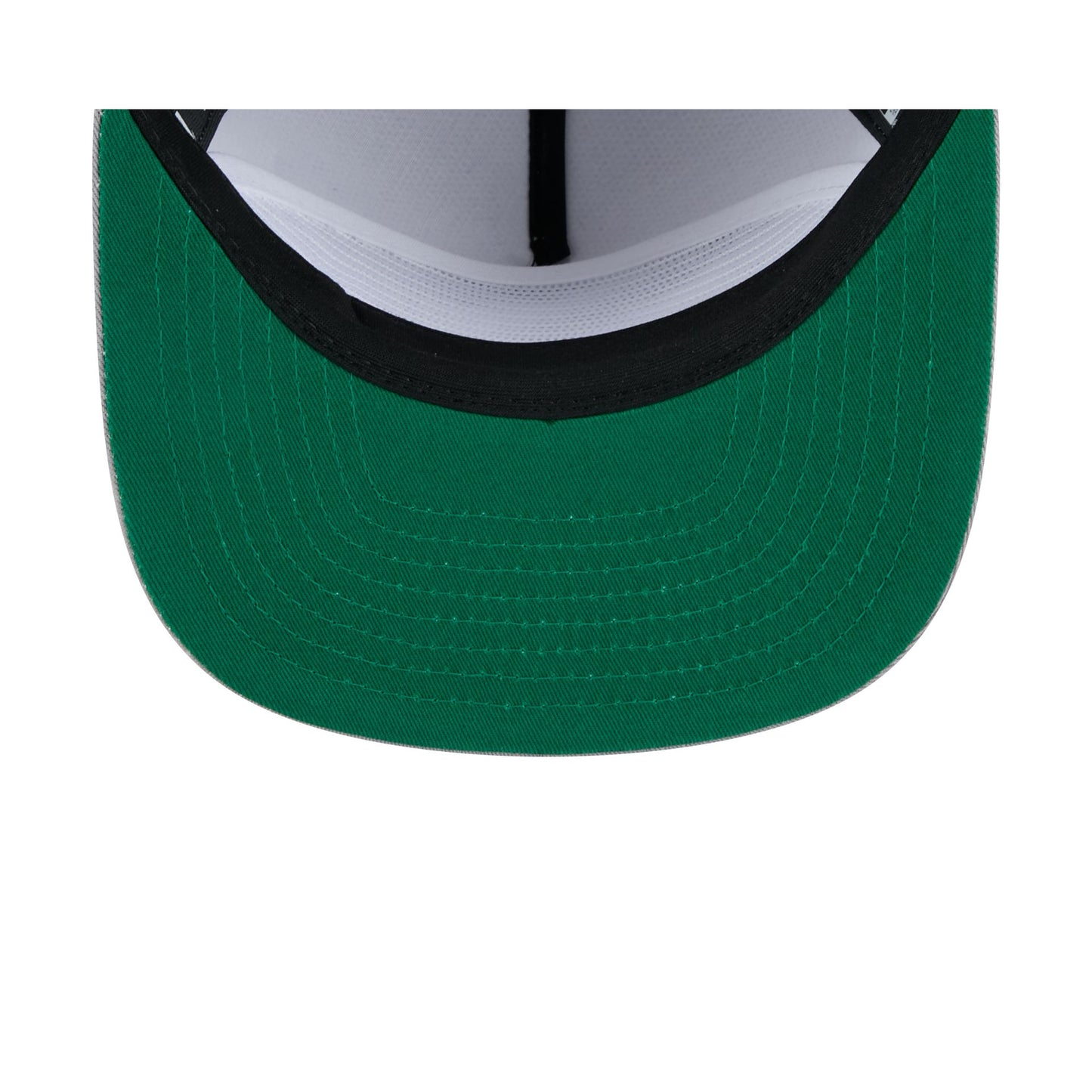 The Dallas Cowboys Vintage Gray Golfer features an embroidered "PROPERTY OF" Cowboys wordmark at the front panels with a team logo at the right-wear side and a rope at the visor. Additional details include a snapback closure at the rear and a green undervisor.