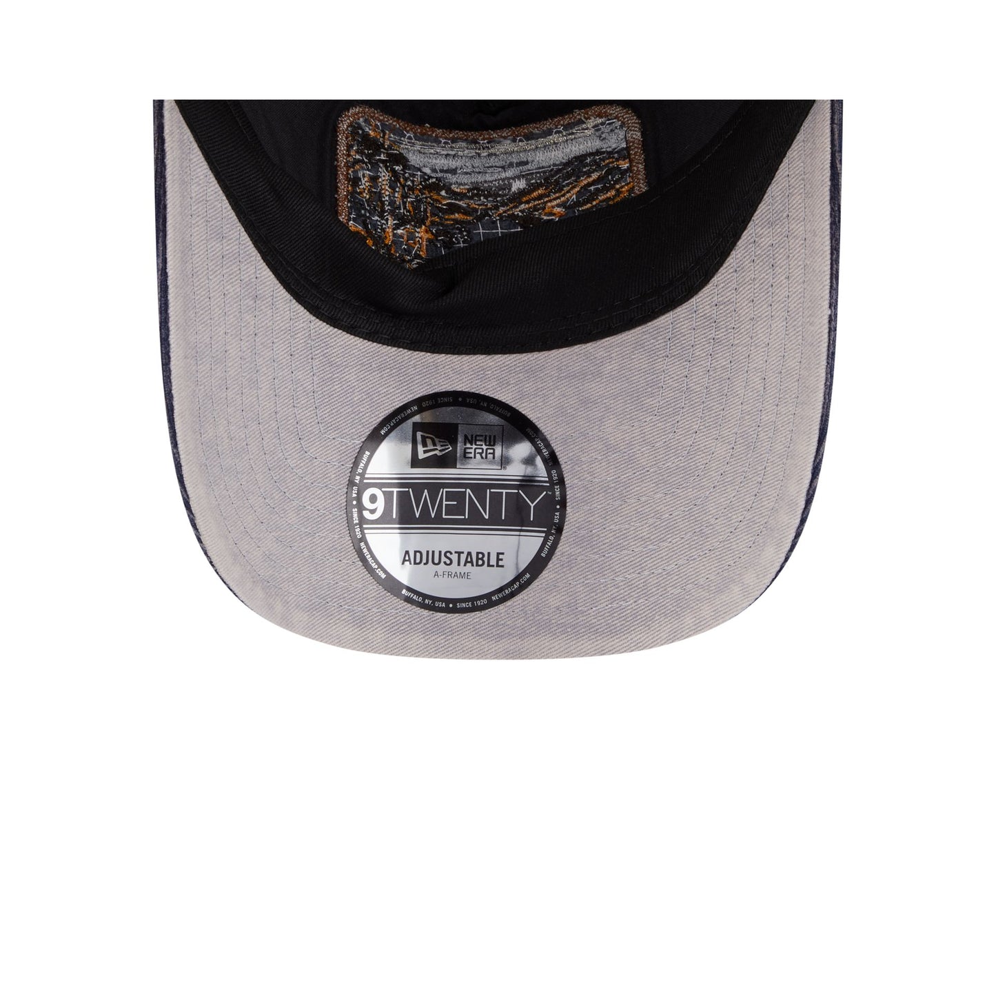 The Dallas Cowboys Vintage Landscape 9TWENTY A-Frame Trucker features an embroidered Cowboys Vintage Landscape patch at the front panels with a team logo at the right-wear side. Additional details include an adjustable snapback closure at the rear and a gray undervisor.